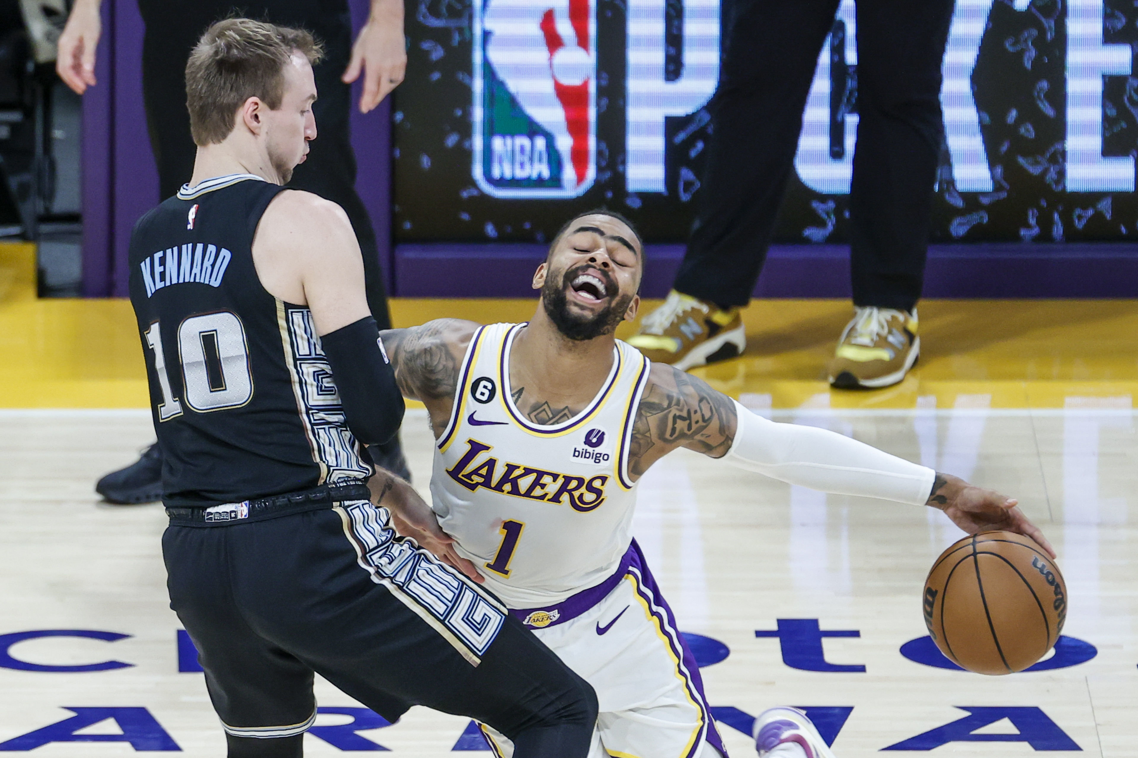 4月22日,湖人队球员丹吉洛·拉塞尔(右)在比赛中进攻受阻。新华社发(赵汉荣摄)