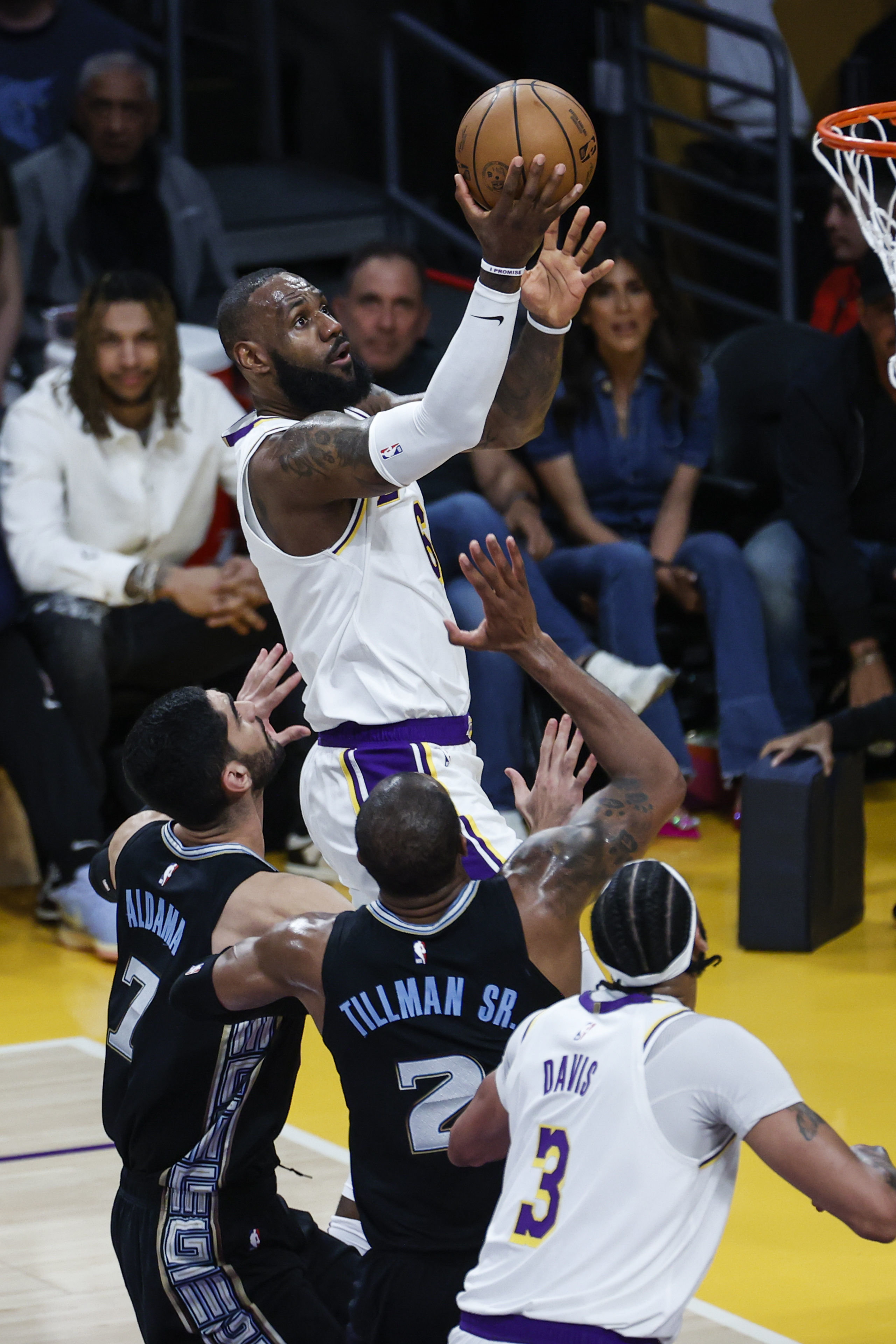 4月22日,湖人队球员勒布朗·詹姆斯(上)在比赛中进攻。新华社发(赵汉荣摄)