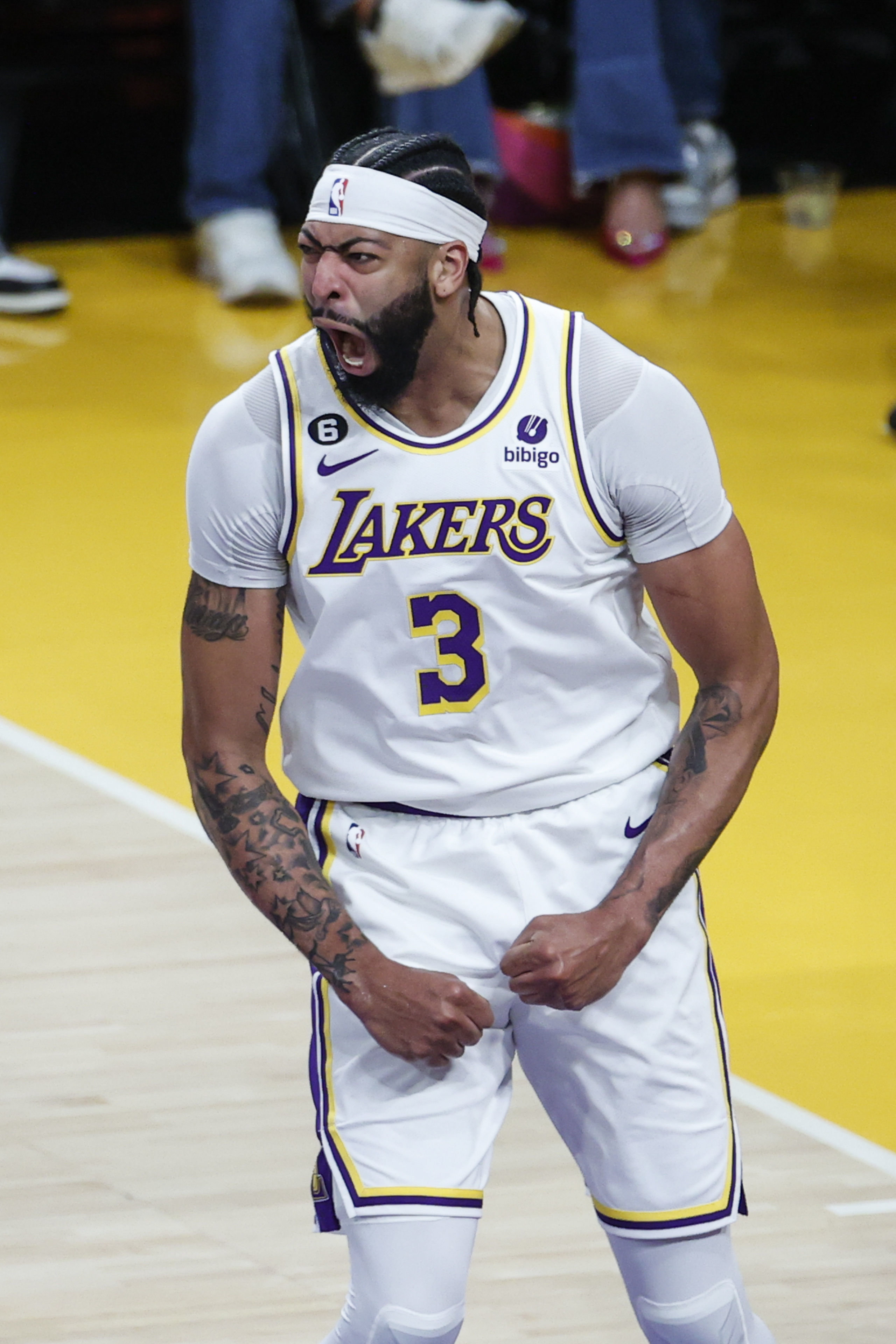 4月22日,湖人队球员安东尼·戴维斯在比赛中庆祝得分。新华社发(赵汉荣摄)