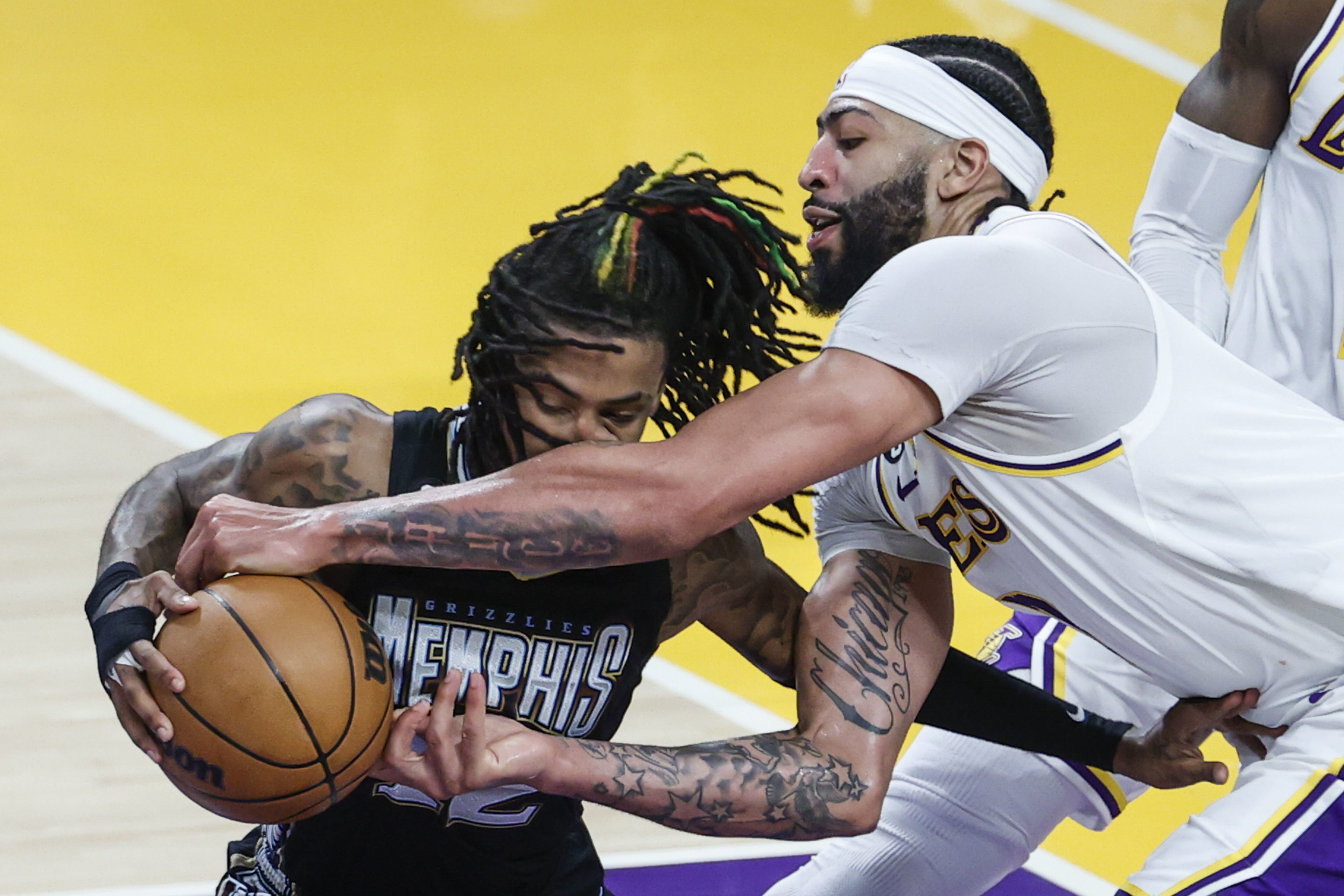 4月22日,灰熊队球员贾·莫兰特(左)与湖人队球员安东尼·戴维斯在比赛中拼抢。新华社发(赵汉荣摄)