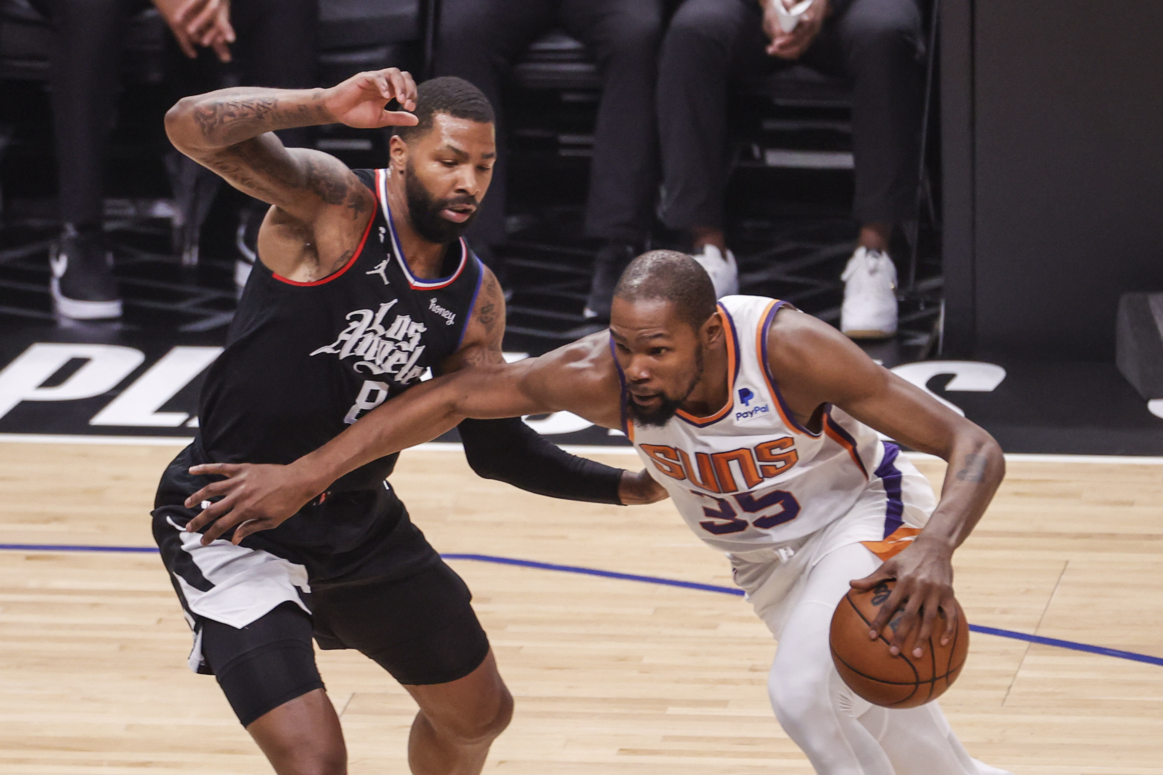 4月22日,太阳队球员凯文·杜兰特(右)在快船队球员马库斯·莫里斯防守下进攻。新华社发(赵汉荣摄)