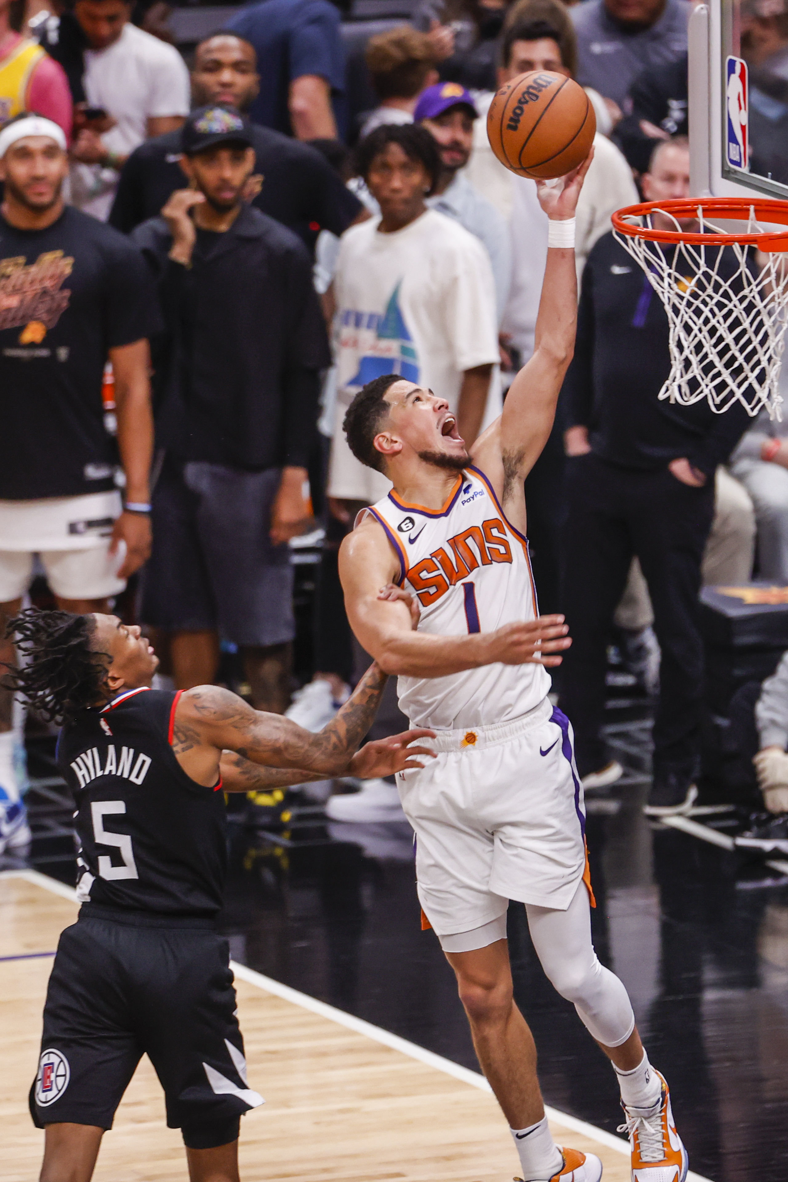 4月22日,太阳队球员德文·布克(右)在比赛中上篮。新华社发(赵汉荣摄)