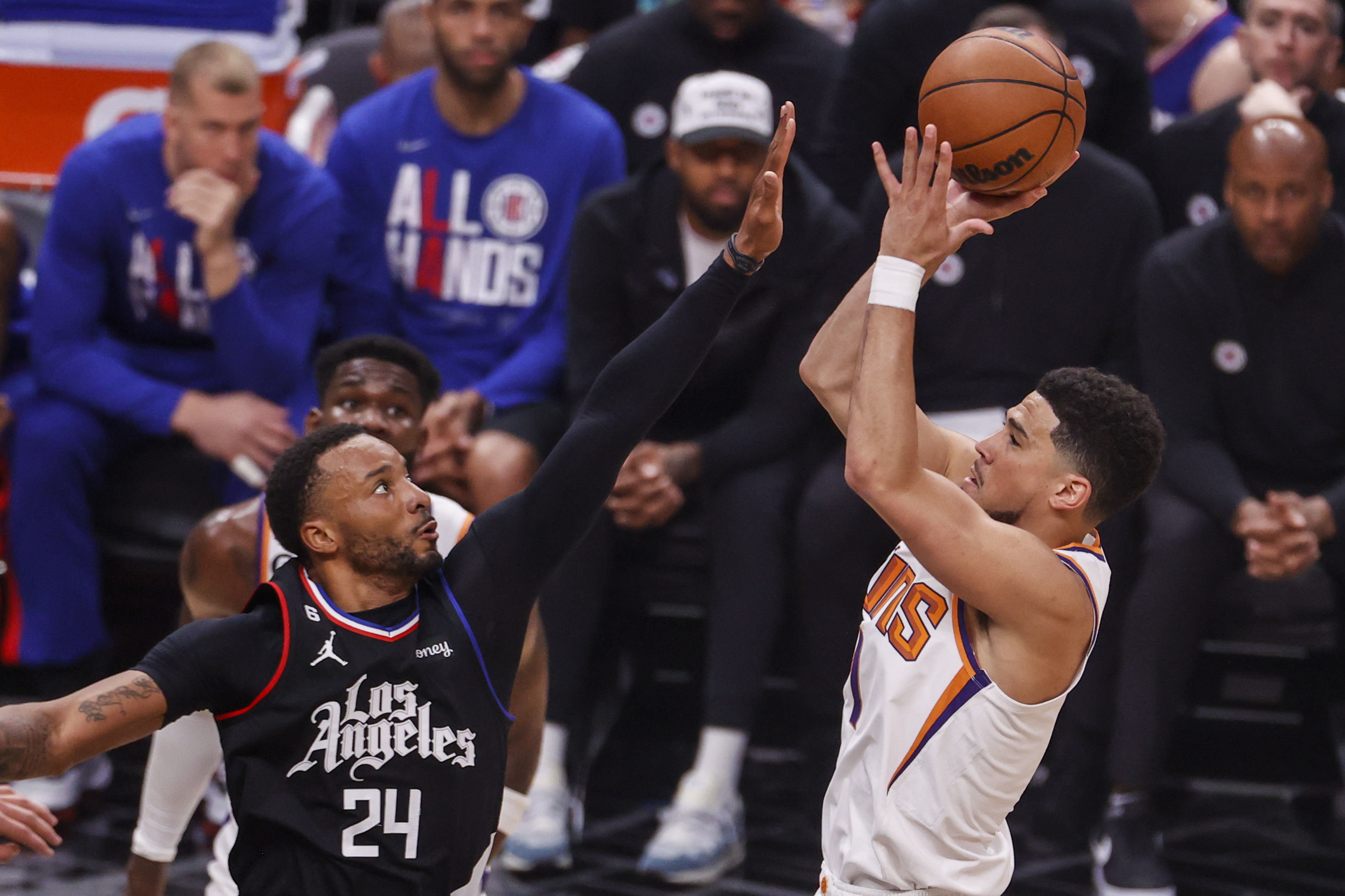 4月22日,太阳队球员德文·布克(右)在快船队球员诺曼·鲍威尔防守下投篮。新华社发(赵汉荣摄)