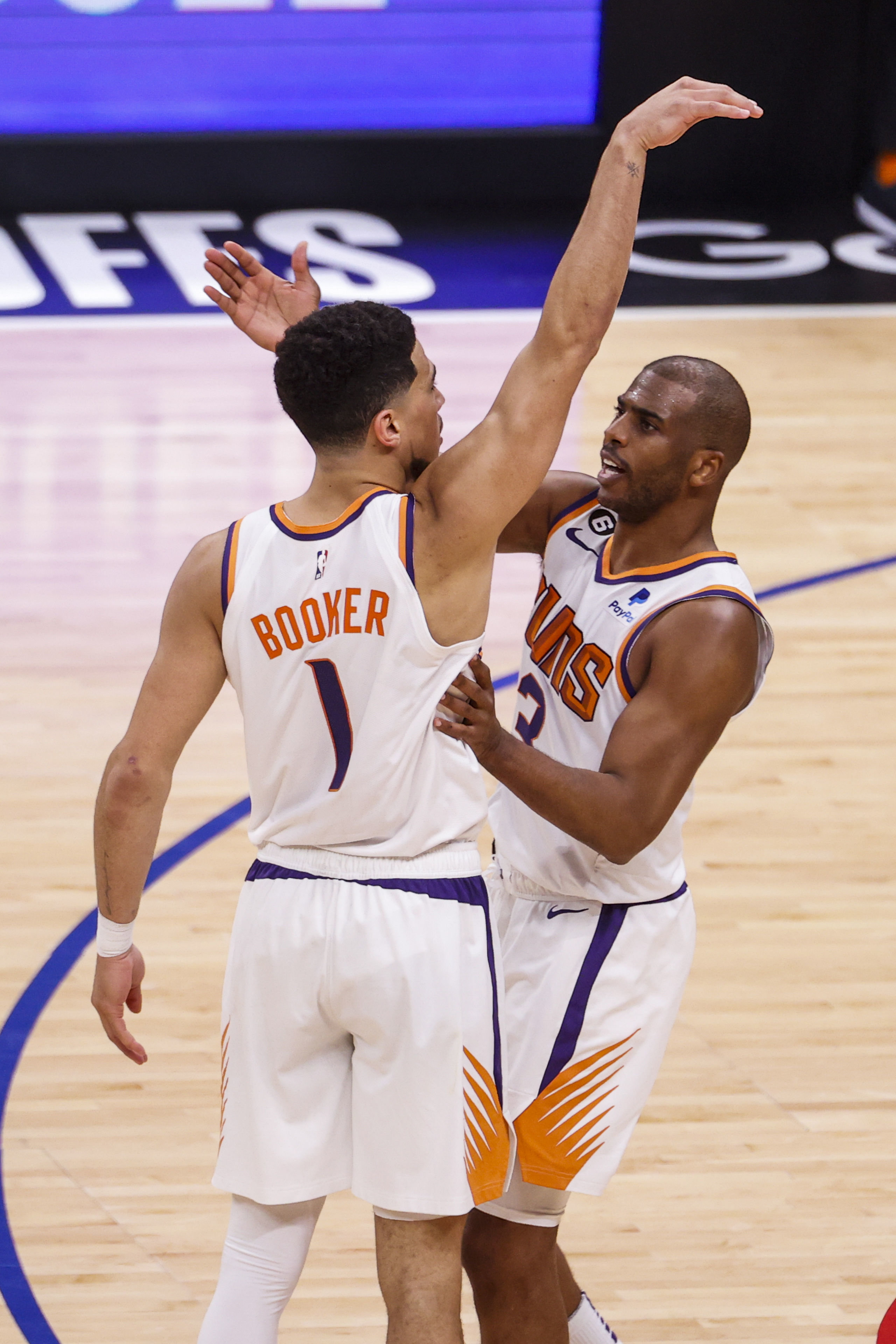 4月22日,太阳队球员德文·布克(左)得分后与队友克里斯·保罗庆祝。新华社发(赵汉荣摄)