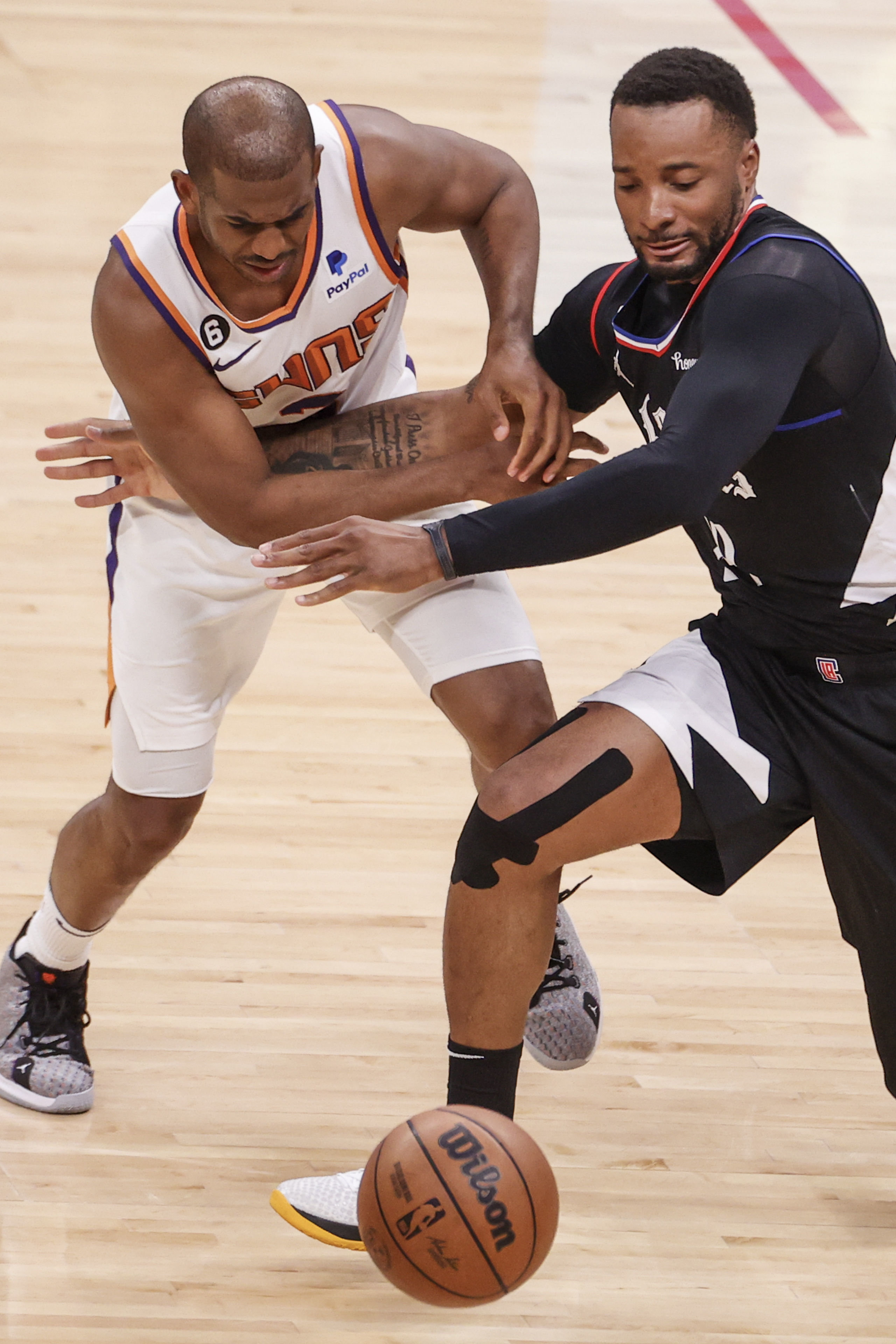 4月22日,太阳队球员克里斯·保罗(左)与快船队球员诺曼·鲍威尔在比赛中拼抢。新华社发(赵汉荣摄)