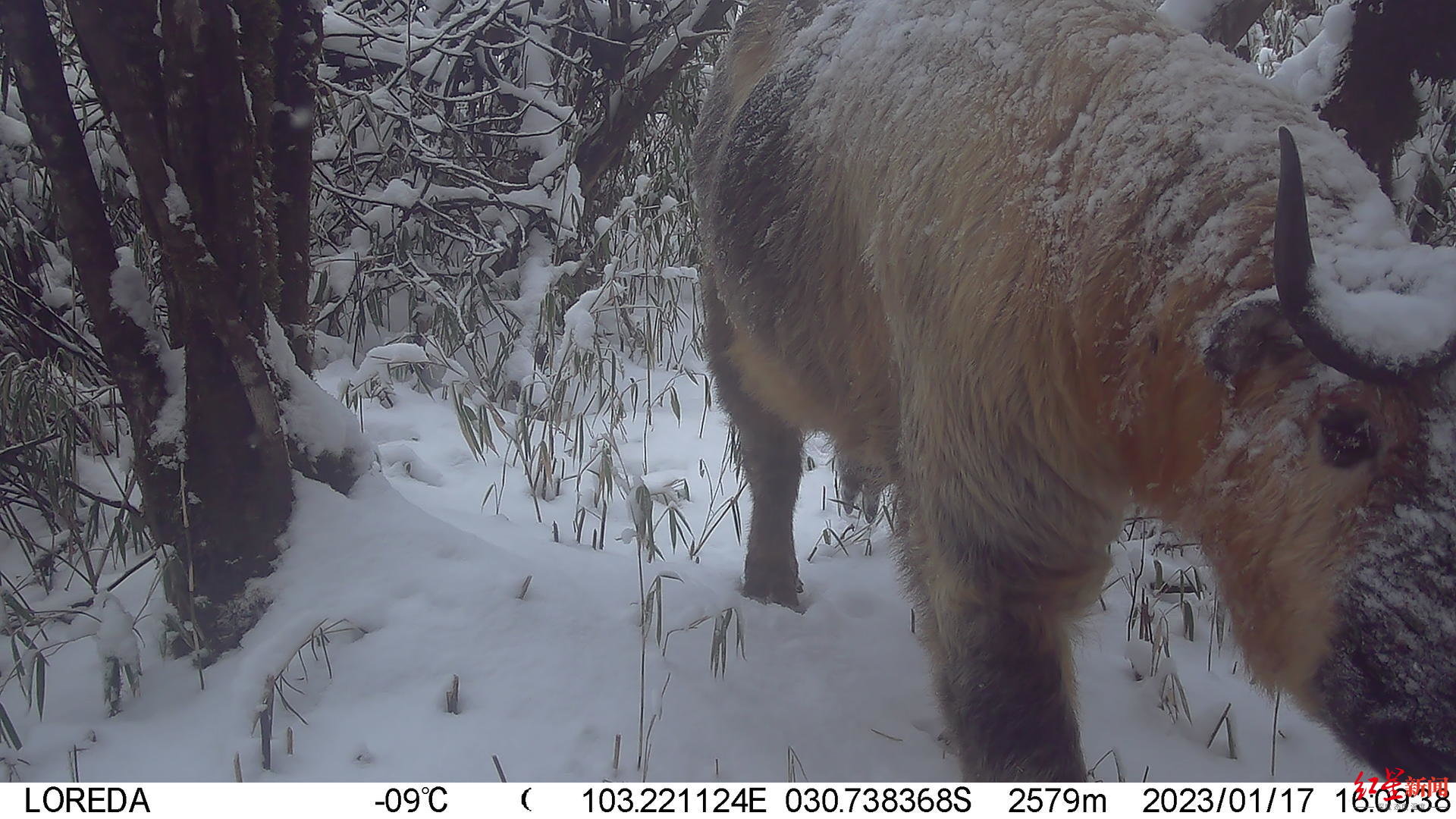 除了大熊猫以外,相机还拍摄到其他野生动物。1月17日,一只羚牛在竹林间和摄像头擦肩而过;2月11日,一只小熊猫拖着红亮的大尾巴踏雪而去。