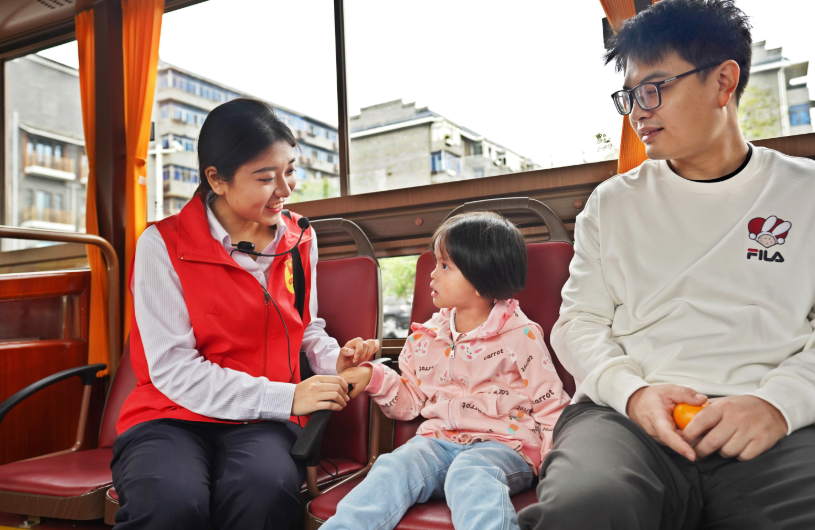 为了让乘客在打卡路上也感受南昌城的人文风貌。南昌公交运输集团不仅在始发站设置服务点,引导游客安全乘车,还准备了城市宣传手册供游客取用。此外,在每台铛铛车上还配有公交服务志愿者作为引导员,向乘客介绍线路、讲述历史、推介景点,与乘客互动。