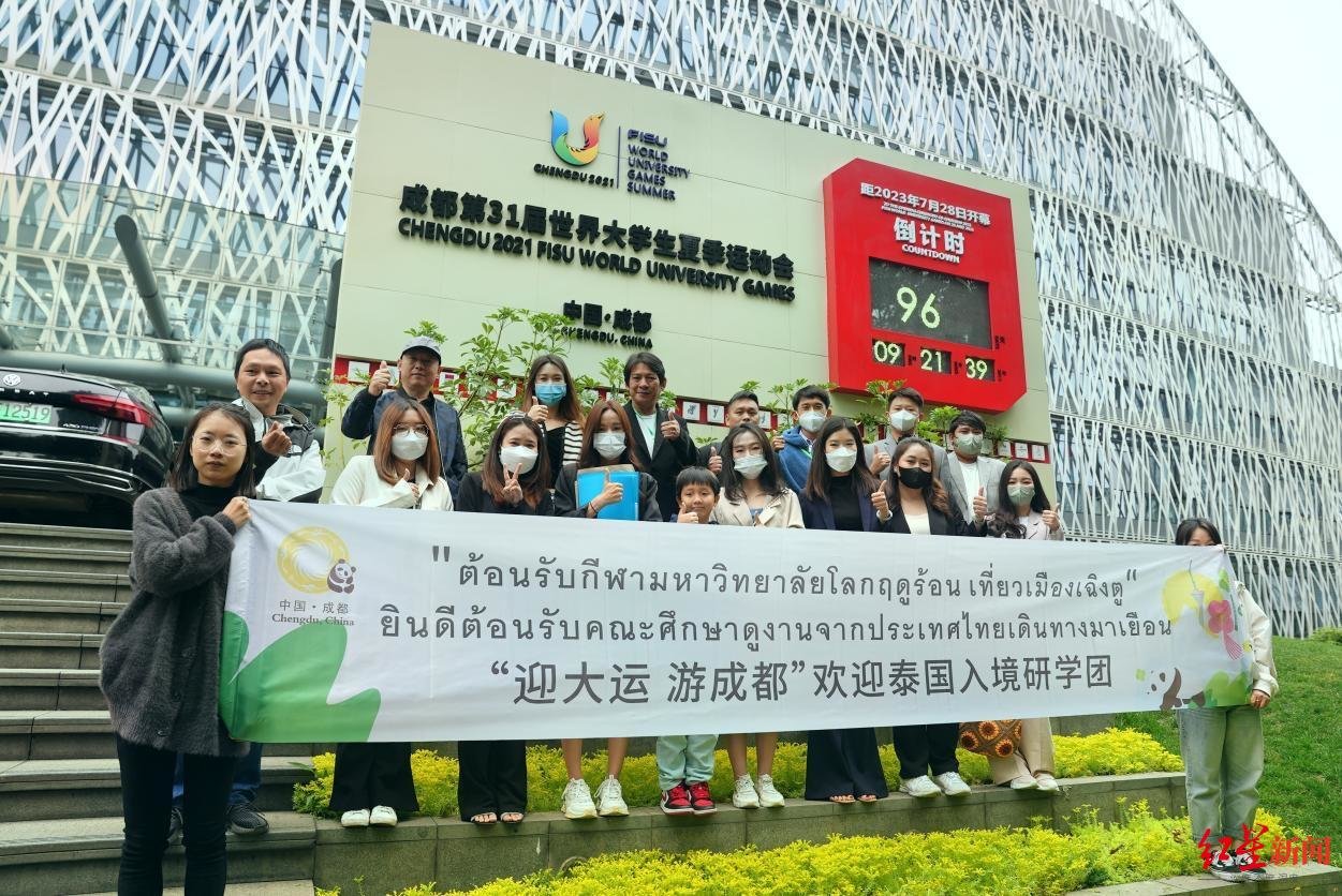 当前,距离成都大运会开幕还有不到100天,来自泰国的研学团队来到这场赛事的筹办地,分享对这场体育盛会的期待。当看到执委会大楼外的成都大运会倒计时牌时,研学团成员们十分激动,纷纷上前合影。