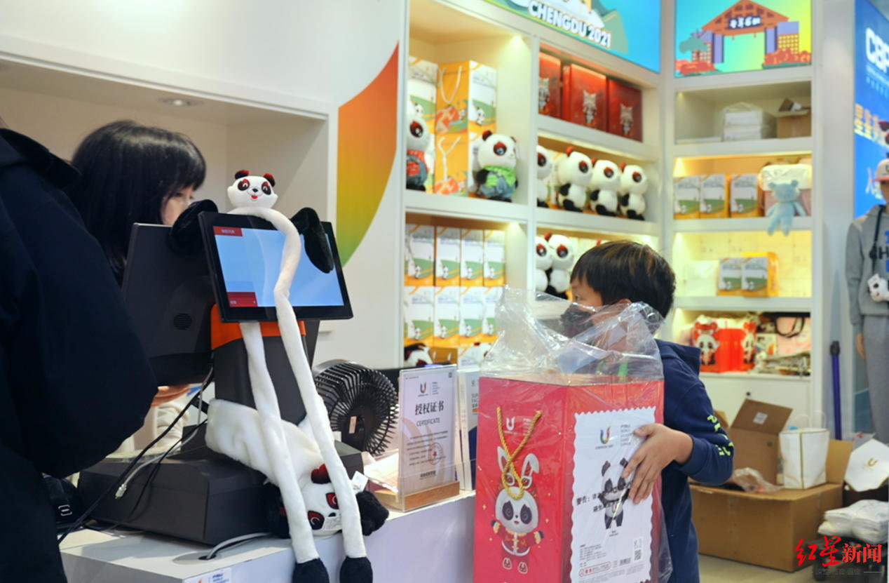 “‘蓉宝’太可爱了!”在成都大运会特许商品零售店内,“蓉宝”公仔等玲琅满目的大运特许商品吸引了研学团的目光,大家精心挑选着商品,准备带一份“大运礼物”给远在泰国的亲友。