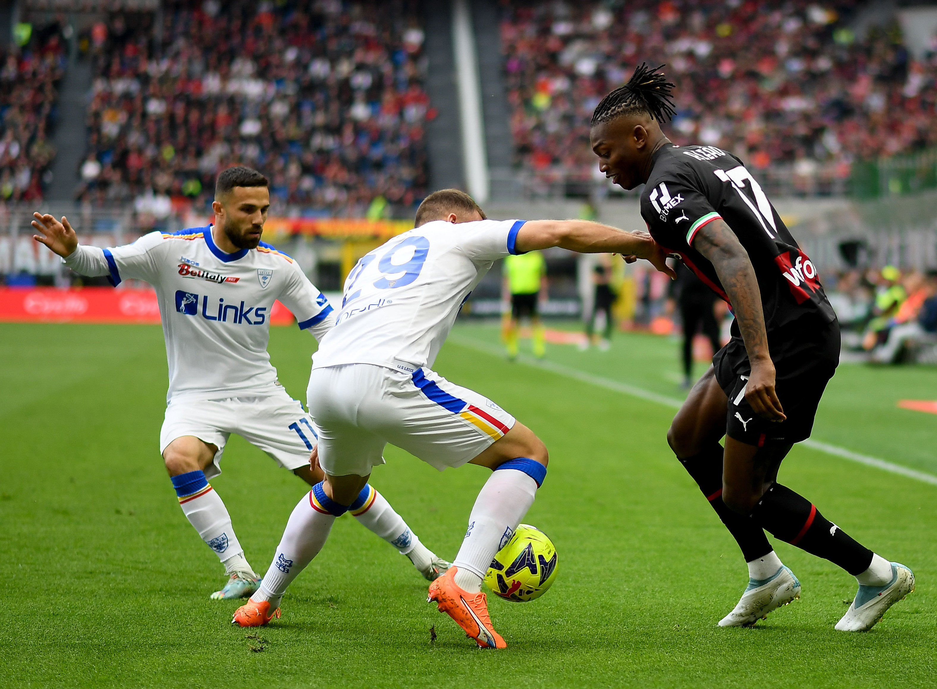 4月23日,AC米兰队球员莱奥(右)与莱切队球员布兰(中)、迪弗朗西斯科在比赛中拼抢。新华社发(奥古斯托·卡萨索利摄)