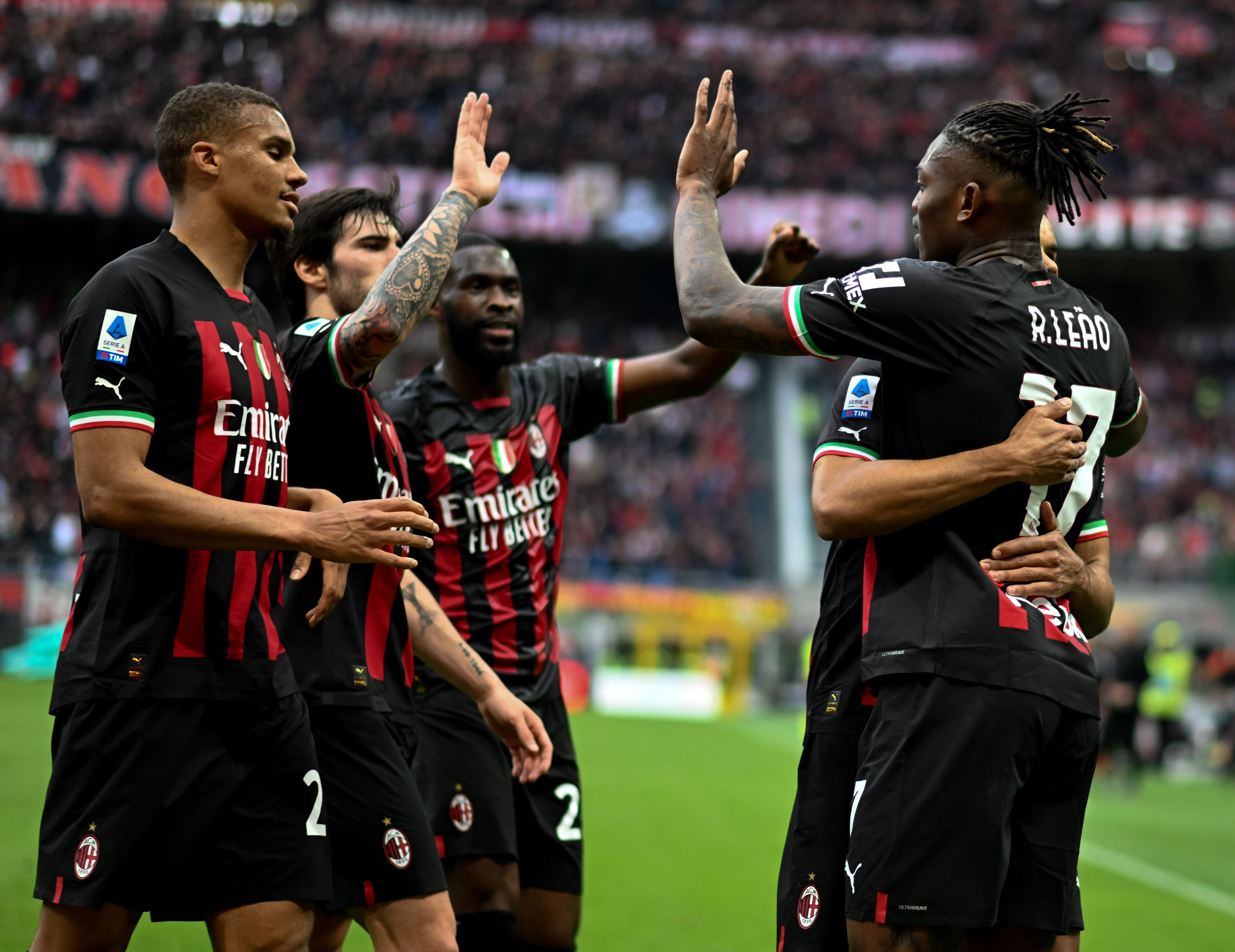 4月23日,AC米兰队球员莱奥(左)进球后与队友托莫里庆祝。新华社发(奥古斯托·卡萨索利摄)