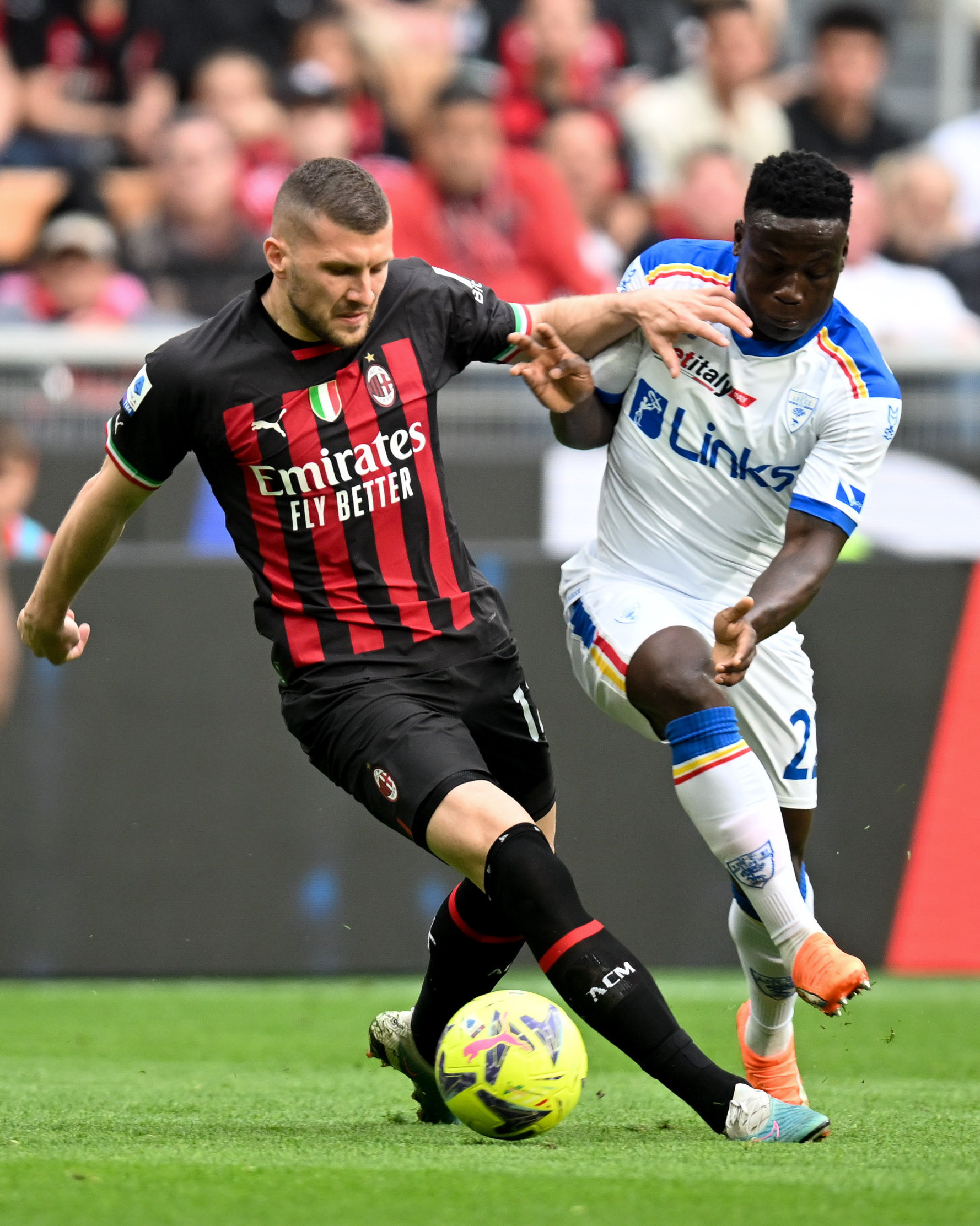 4月23日,AC米兰队球员雷比奇(左)与莱切队球员班达在比赛中拼抢。新华社发(奥古斯托·卡萨索利摄)