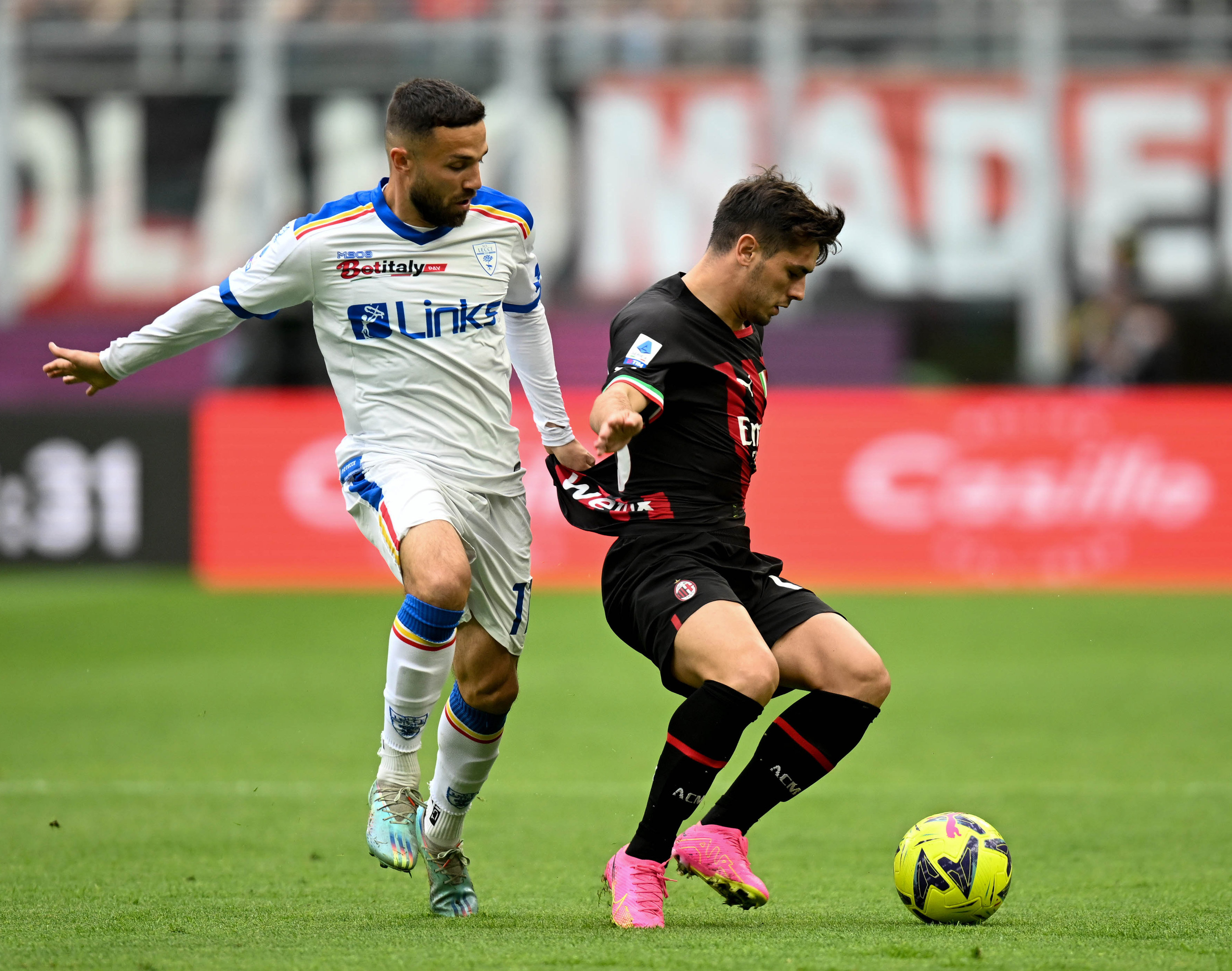 4月23日,AC米兰队球员迪亚兹(左)与莱切队球员赫尤尔曼德在比赛中拼抢。新华社发(奥古斯托·卡萨索利摄)