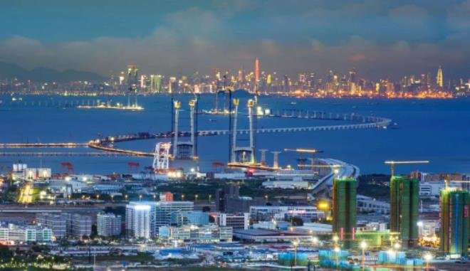 从中山翠亨新区望向深圳宝安前海,正在建设的深中通道将两地连接起来(资料照片)。深中通道全长24公里,集桥、岛、隧、地下互通为一体,连接珠江口东西两岸的深圳市和中山市,预计2024年建成通车。