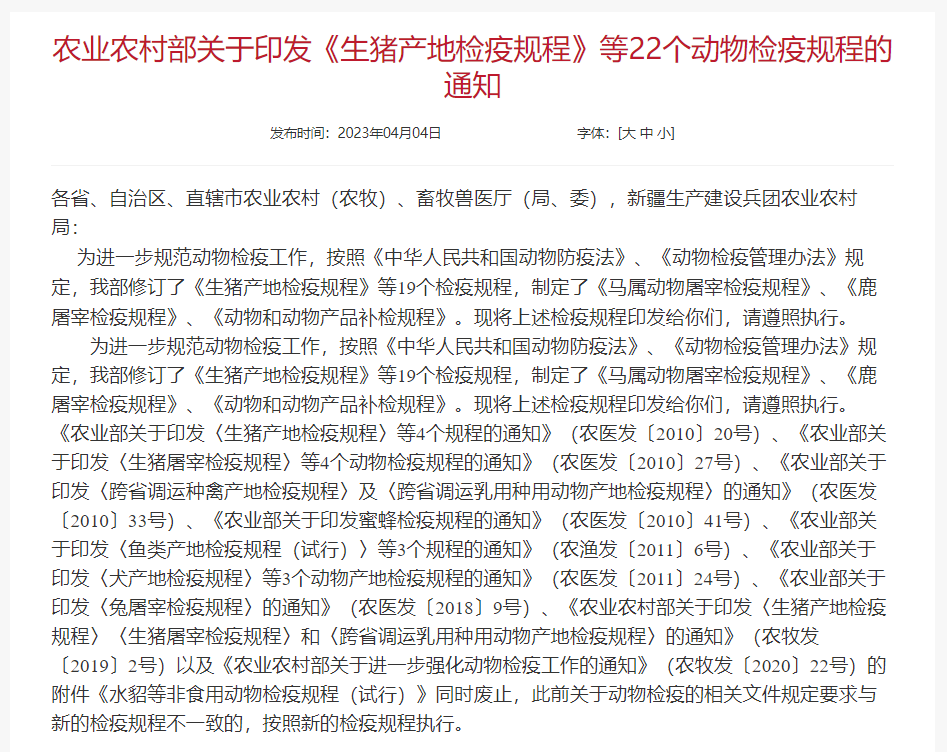 农业农村部还指出,此前印发的相关通知和规程同时废止,“此前关于动物检疫的相关文件规定要求与新的检疫规程不一致的,按照新的检疫规程执行”。