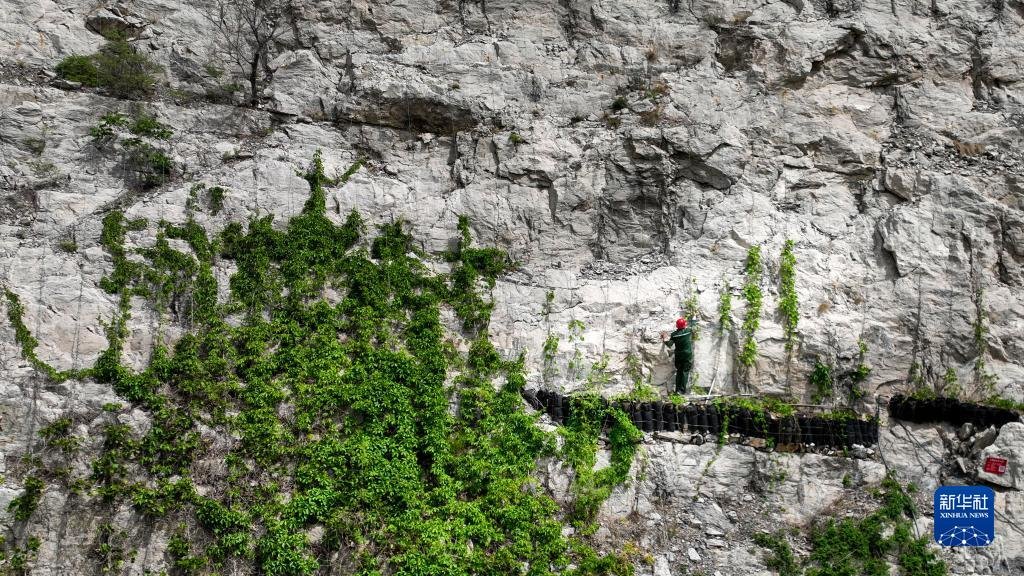 双手交替抓住简易扶手,沿着开凿在陡壁上的小石阶,54岁的刘彦林向着半山腰处不足一米宽的狭长平台攀爬,身体几乎贴在石壁上。“这是一处‘微地貌利用专利验证试验区’,是藤本植物长距离攀爬途中的营养‘补给站’。我们依地形营造适宜的水土条件,希望它们到达这个高度后能落地生根;我们也在这里栽种了几种藤本植物,让它们有机会覆盖到山体的更高部位。”
