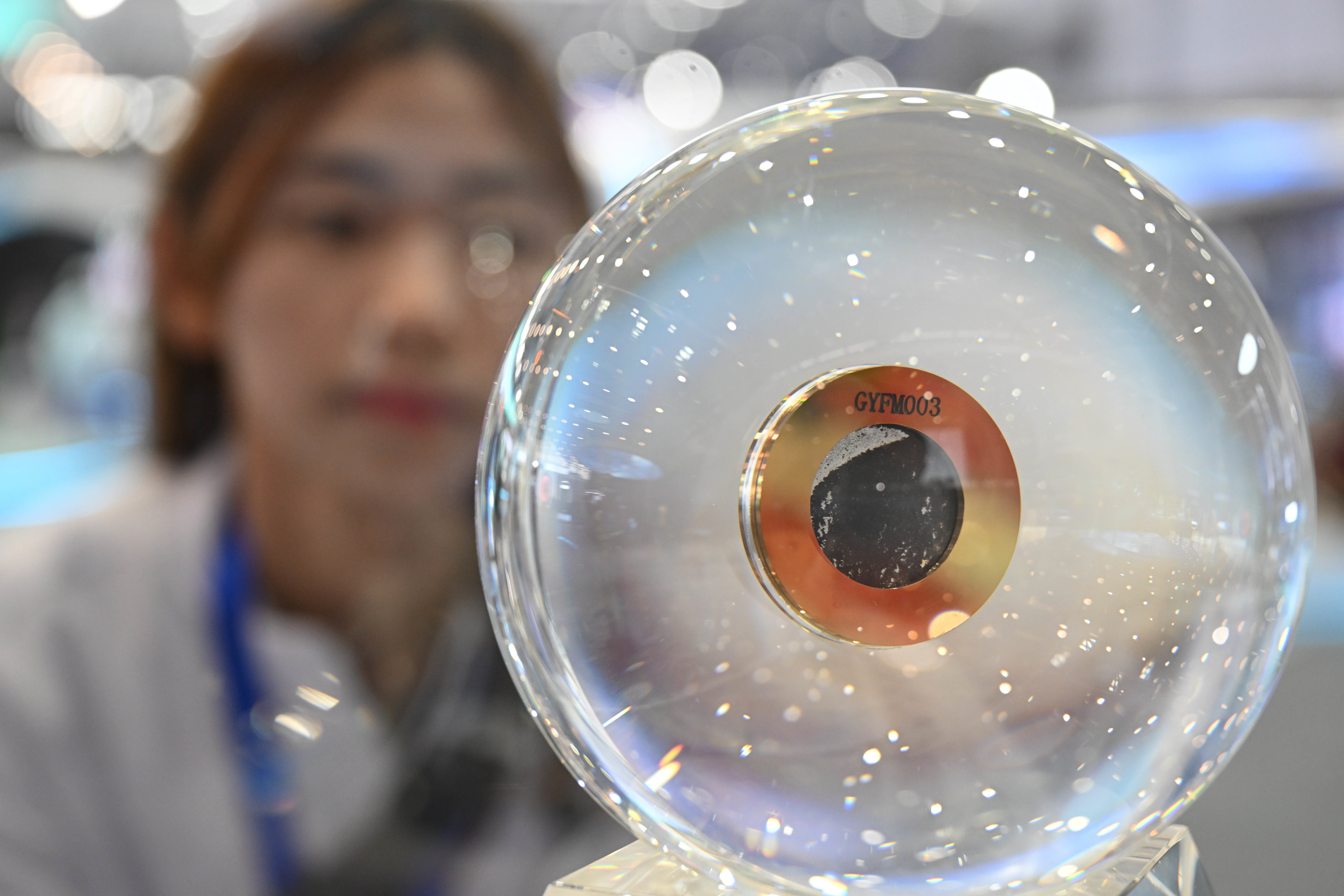 4月24日,观众在2023年“中国航天日”科普展览上观察月壤。新华社记者 黄博涵 摄