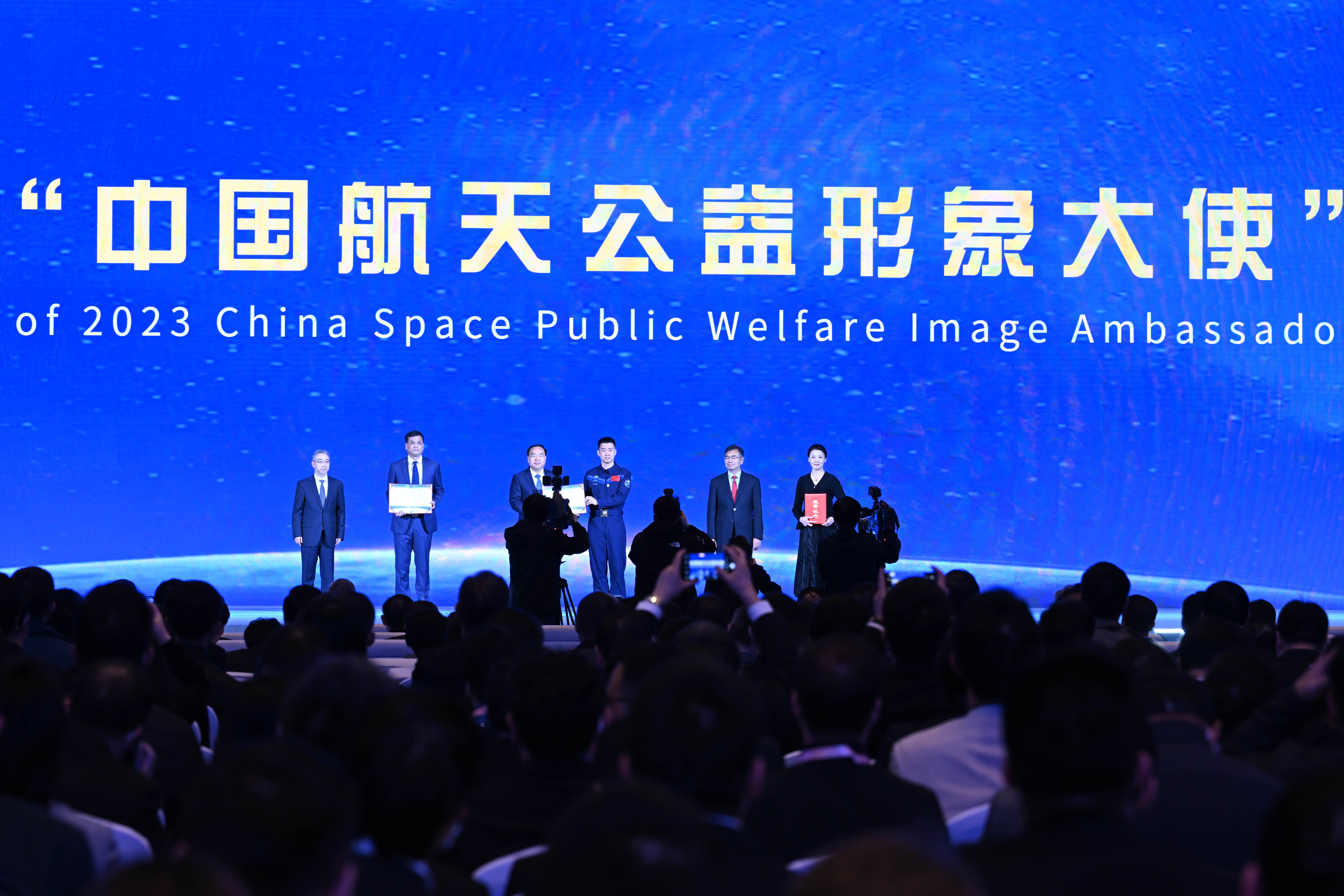 4月24日,航天员陈冬(右三)、中国科学院院士王赤(左二)、黄梅戏表演艺术家韩再芬(右一)被授予2023年“中国航天公益形象大使”称号。新华社记者 黄博涵 摄