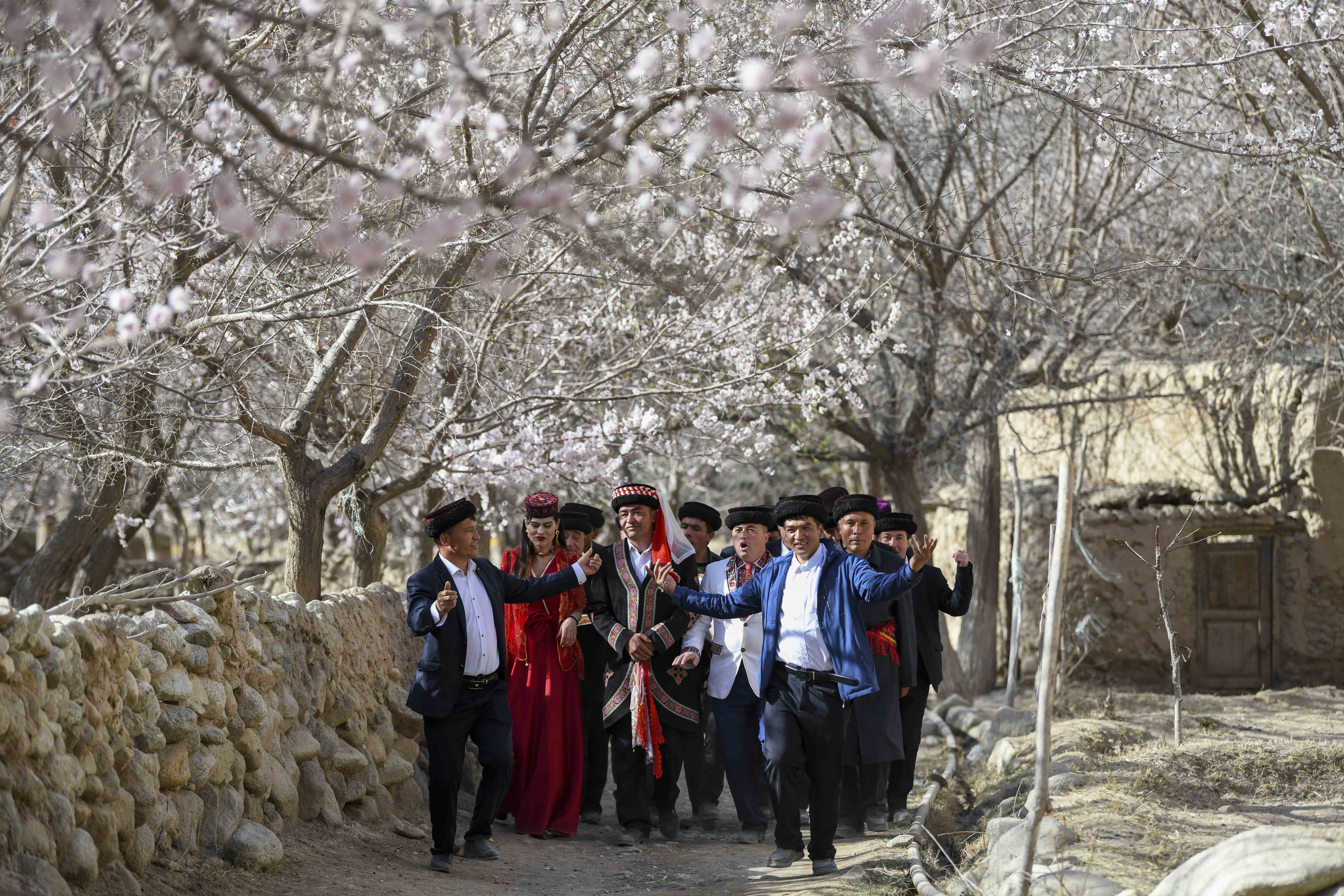 新疆阿克陶县塔尔塔吉克民族乡巴格艾格孜村,人们为游客表演传统婚俗中的迎亲仪式(3月28日摄)。新华社记者 胡虎虎 摄