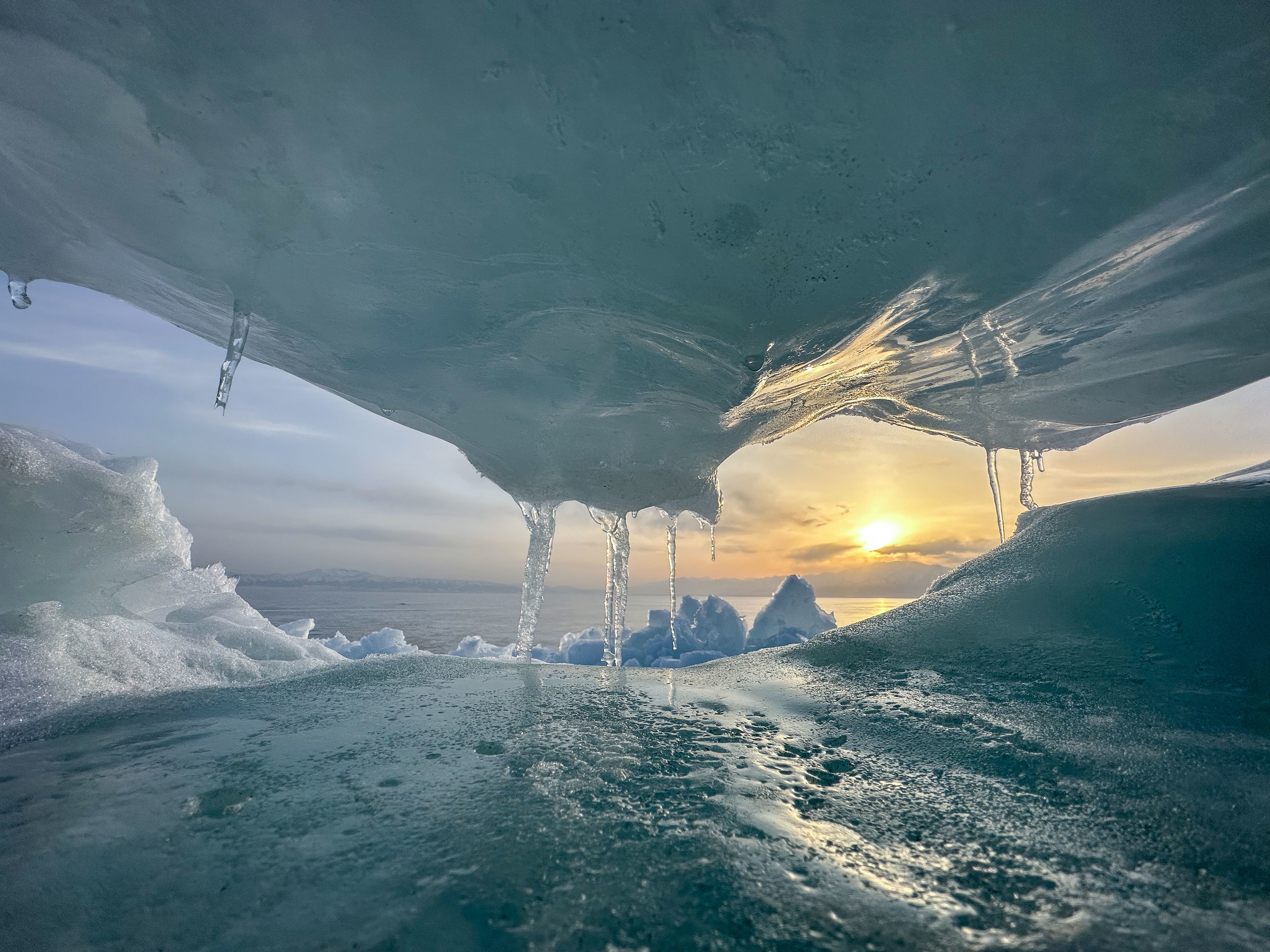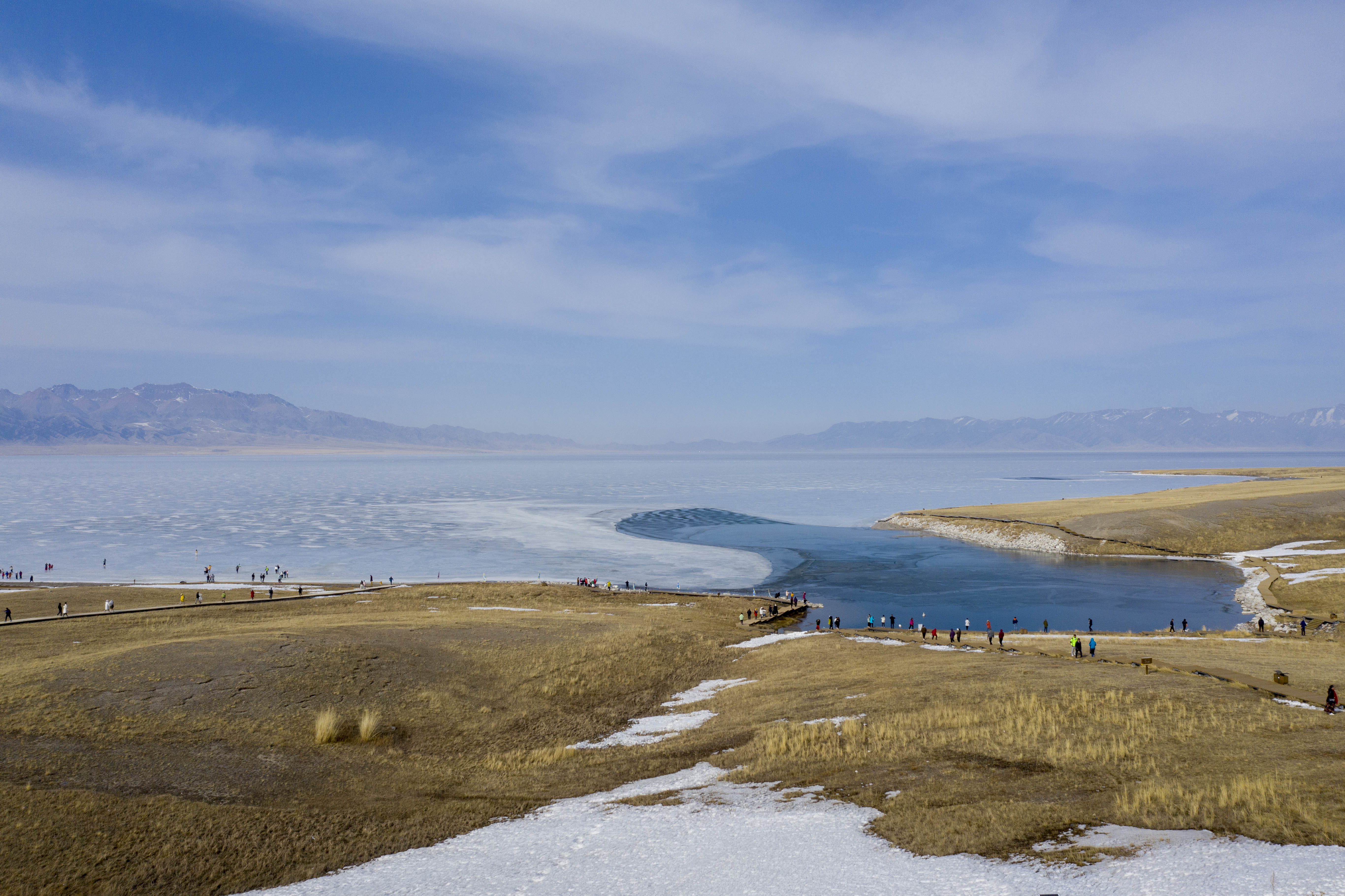 在新疆博尔塔拉蒙古自治州拍摄的赛里木湖(4月6日摄,无人机照片)。4月,随着气温不断升高,冰封数月的湖面逐渐融化,巨大的冰面在湖水的作用下涌向岸边,绵延数十公里。因湖水含有矿物质,“冰推”期的赛里木湖冰面呈现独特的淡蓝色。新华社记者 杨植森 摄