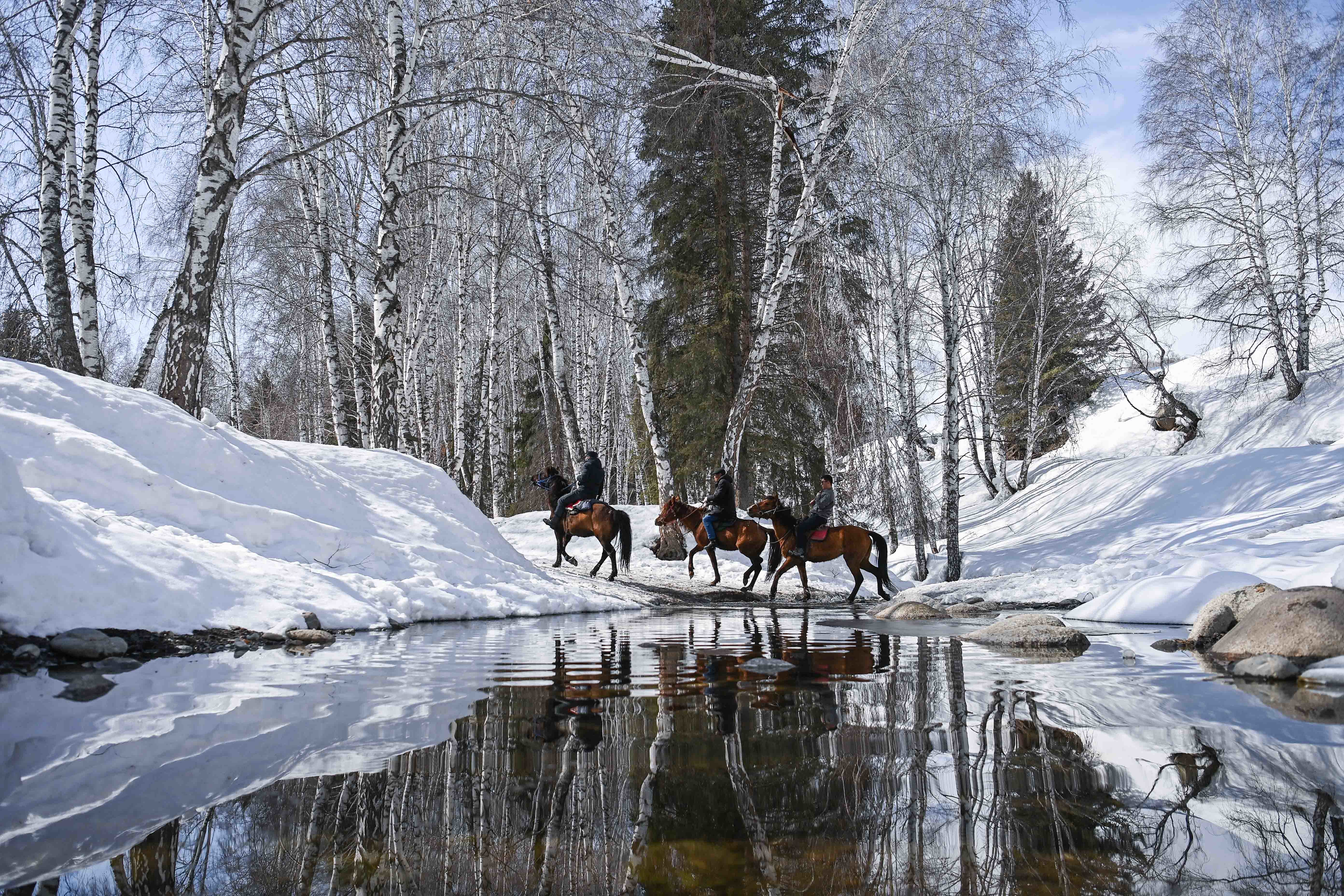 新疆喀纳斯景区禾木村,禾木村党支部书记、村委会主任苏卡(右)和马队队员巡视观光马队上山路线(3月30日摄)。新华社记者 李响 摄