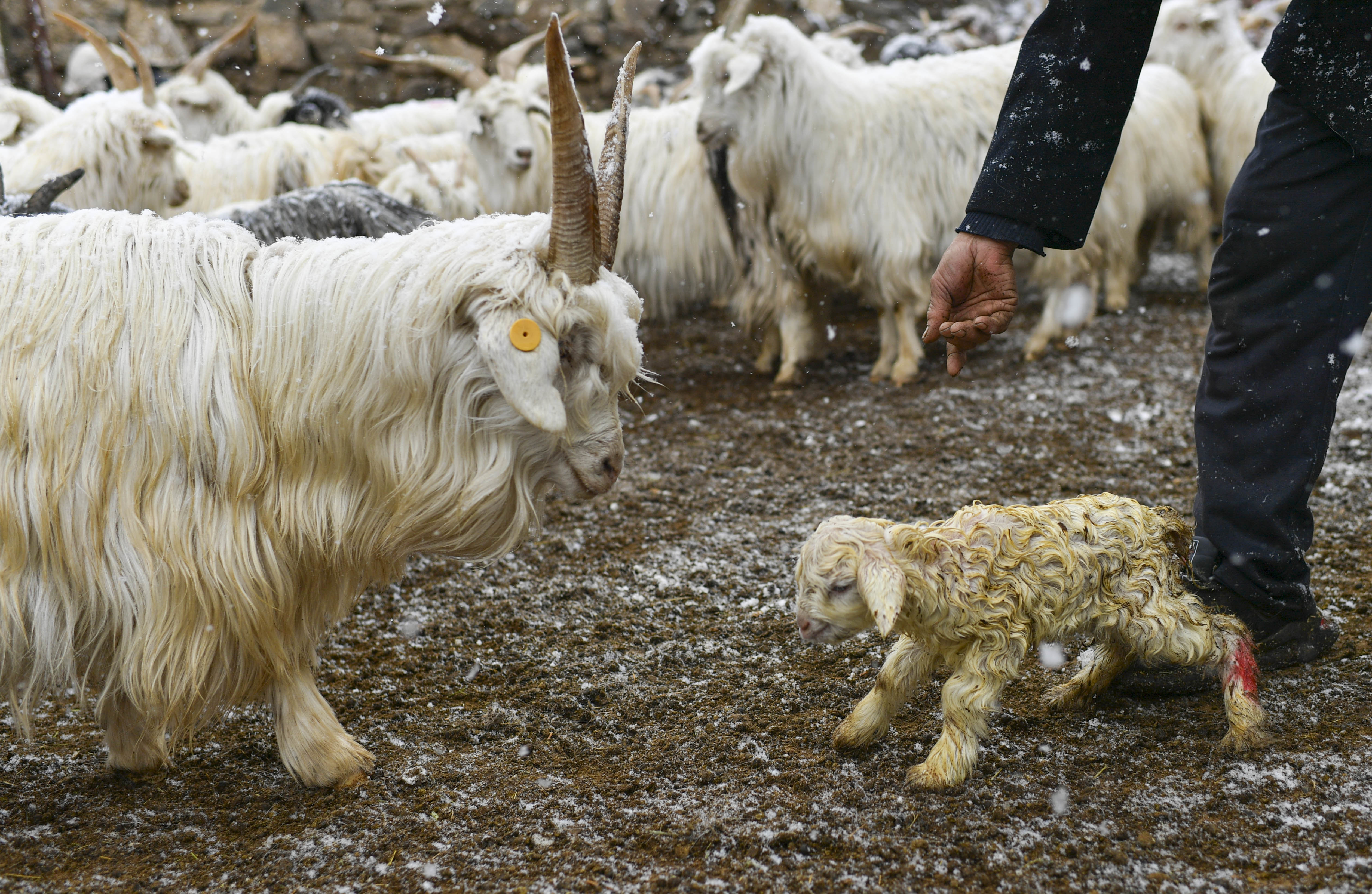 新疆塔城地区裕民县,牧民哈布得拉什么帮助一只当天上午出生的小羊羔回到母羊身边吃奶(4月12日摄)。新华社记者 胡虎虎 摄