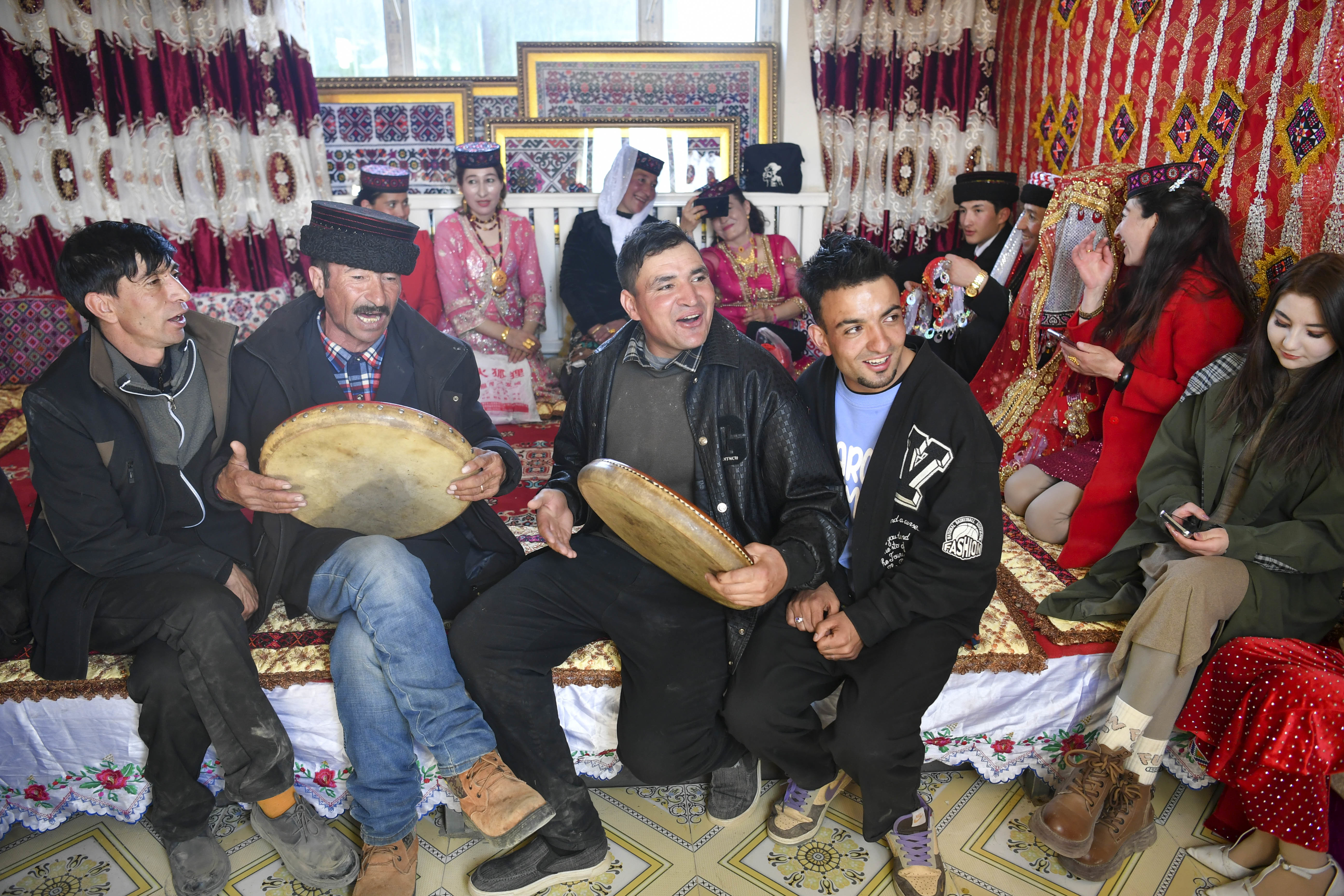 新疆塔什库尔干塔吉克自治县富民村,亲友们在婚礼仪式上放声高歌,为新人送上祝福(3月19日摄)。25岁的古丽汗·赞加比力和相恋三年多的买热买提汗·青铁木尔举行婚礼,仪式按当地民俗传统进行,亲友、村民载歌载舞,相聚庆贺。新华社记者 胡虎虎 摄