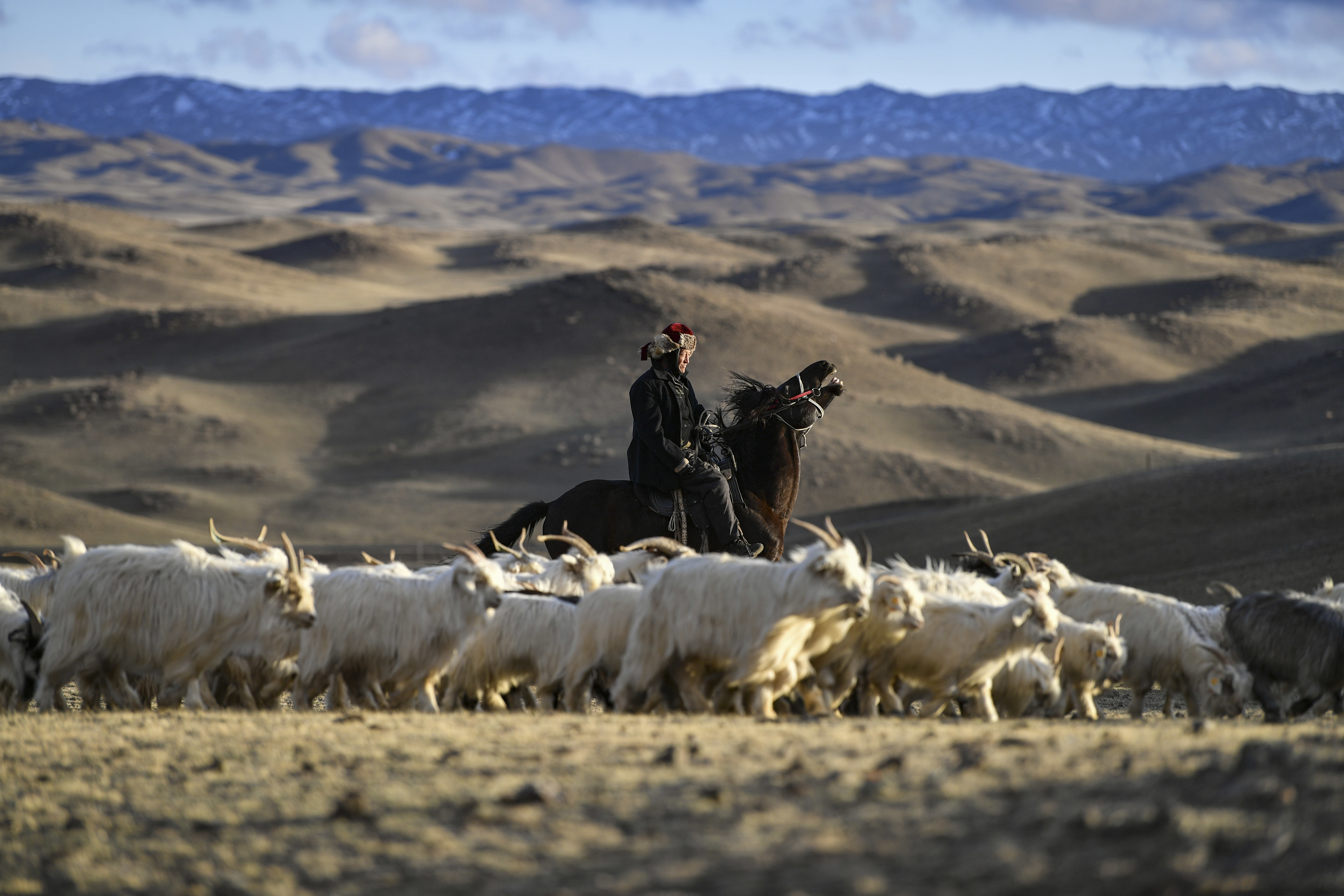 新疆塔城地区裕民县,牧归时分,牧民哈布得拉什么骑马赶着羊群行进在春草场上(4月12日摄)。新华社记者 胡虎虎 摄
