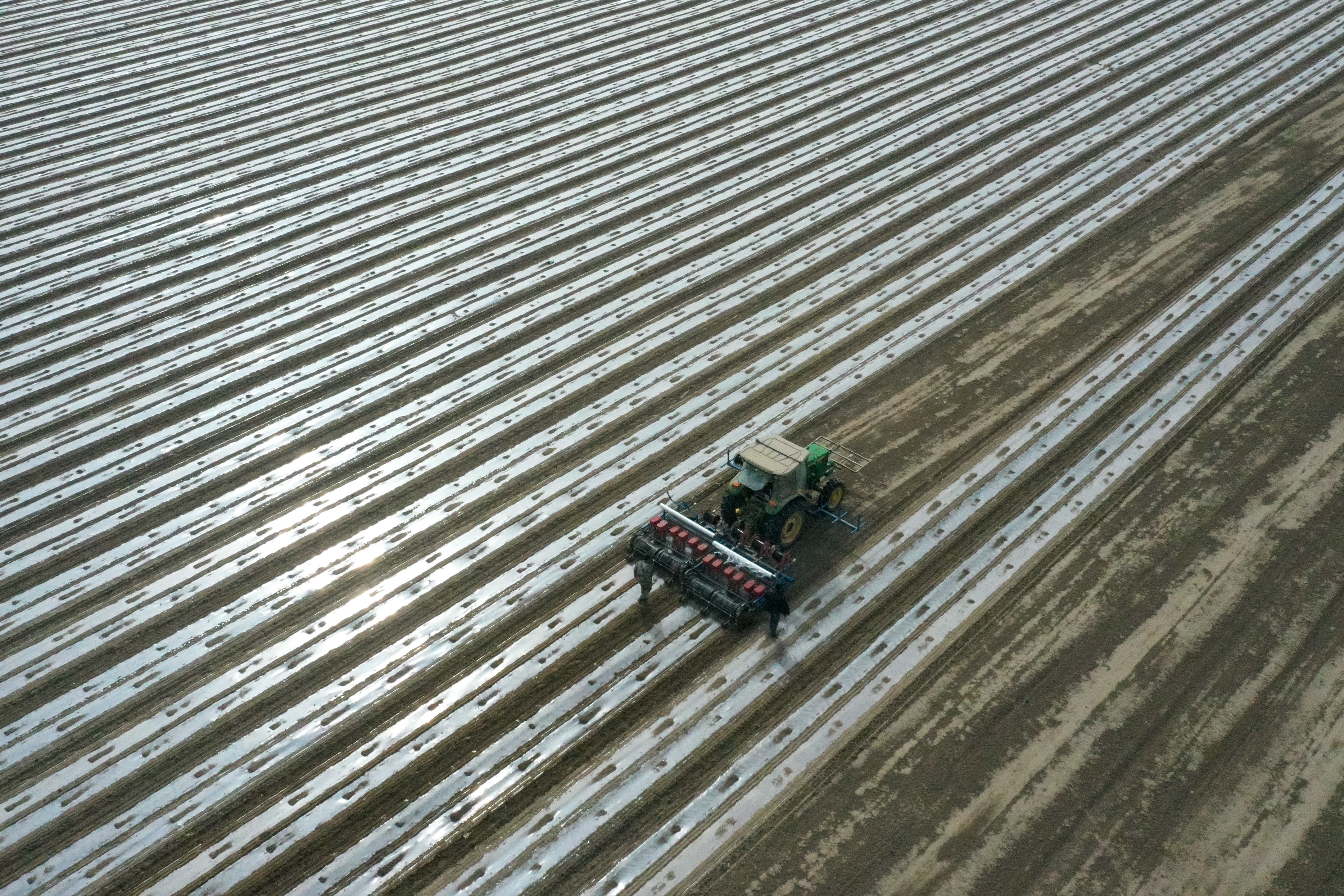 新疆麦盖提县,搭载北斗导航自动驾驶系统的精量播种机在棉田春播(4月2日摄)。新华社记者 丁磊 摄