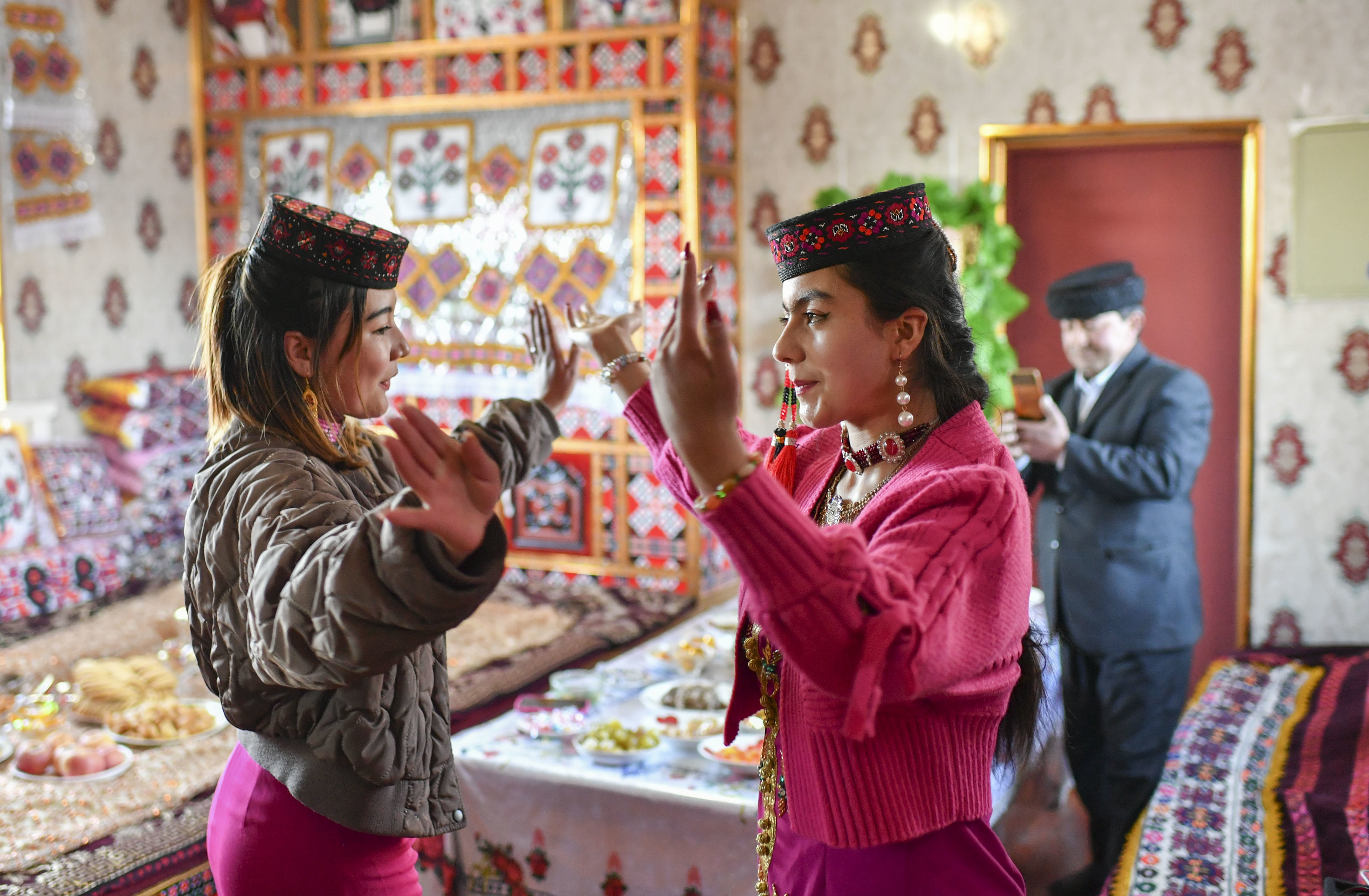 新疆塔什库尔干塔吉克自治县爱民村,牧民都热·加尔曼的侄女古扎丽努尔(前右)带着好朋友来串门拜访,都热·加尔曼在一旁拍摄视频(3月21日摄)。2018年冬,都热一家享受易地扶贫搬迁政策,搬迁至距离县城约30公里的新村。在惠民政策的引导下,都热一家靠双手创造了与祖辈不同的新生活。新华社记者 胡虎虎 摄