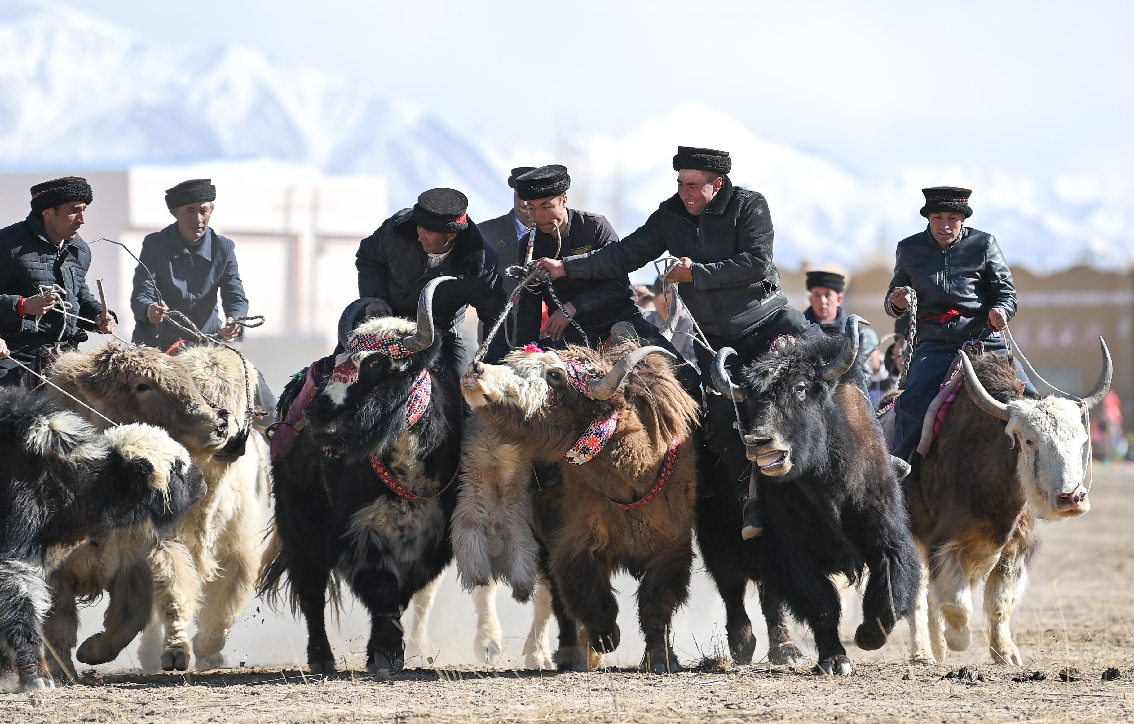 新疆塔什库尔干塔吉克自治县,选手在肖贡巴哈尔节开幕式上进行“牦牛叼羊”比赛(3月21日摄)。肖贡巴哈尔节是塔吉克族的传统节日,有“新年”“迎春”之意。新华社记者 李响 摄
