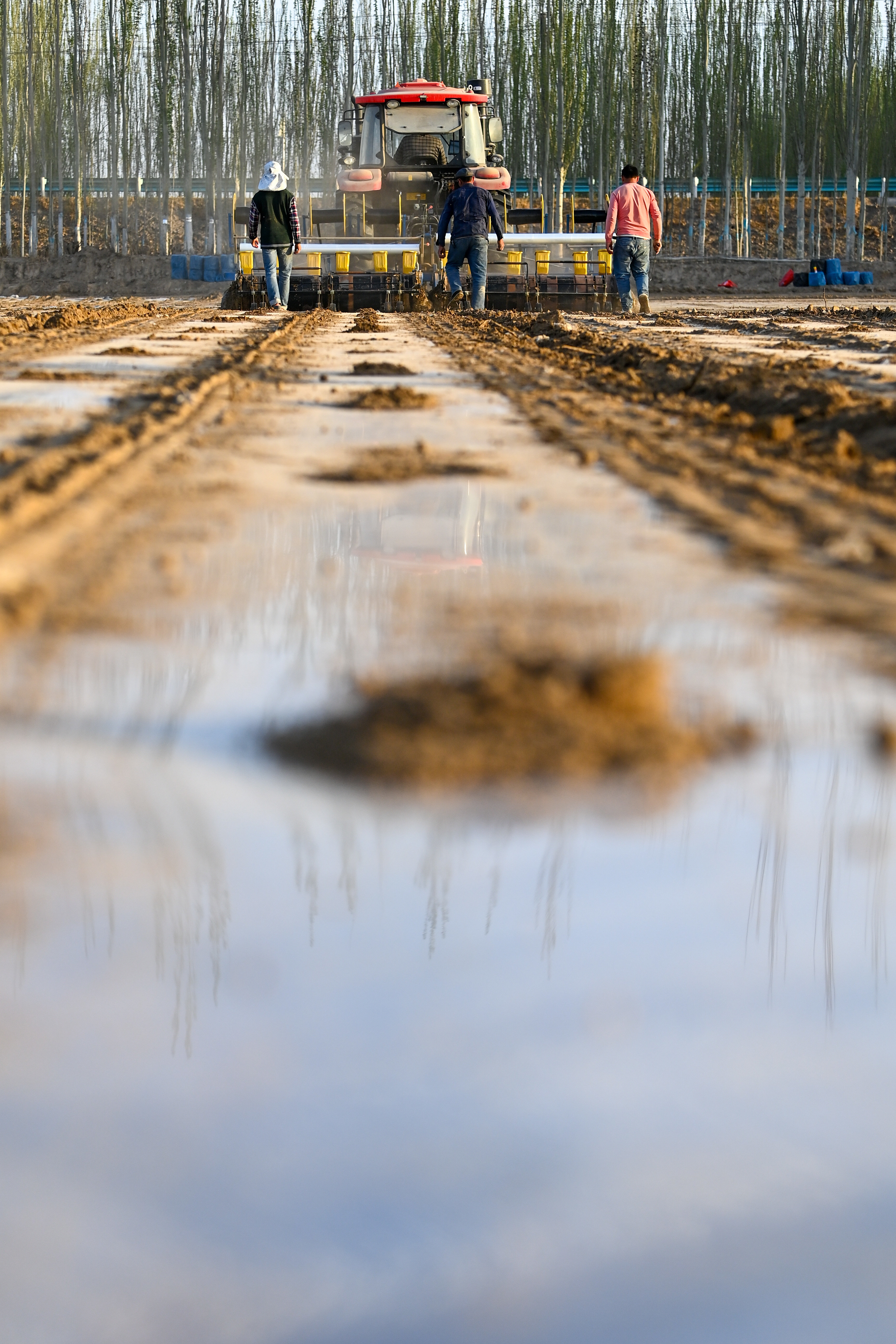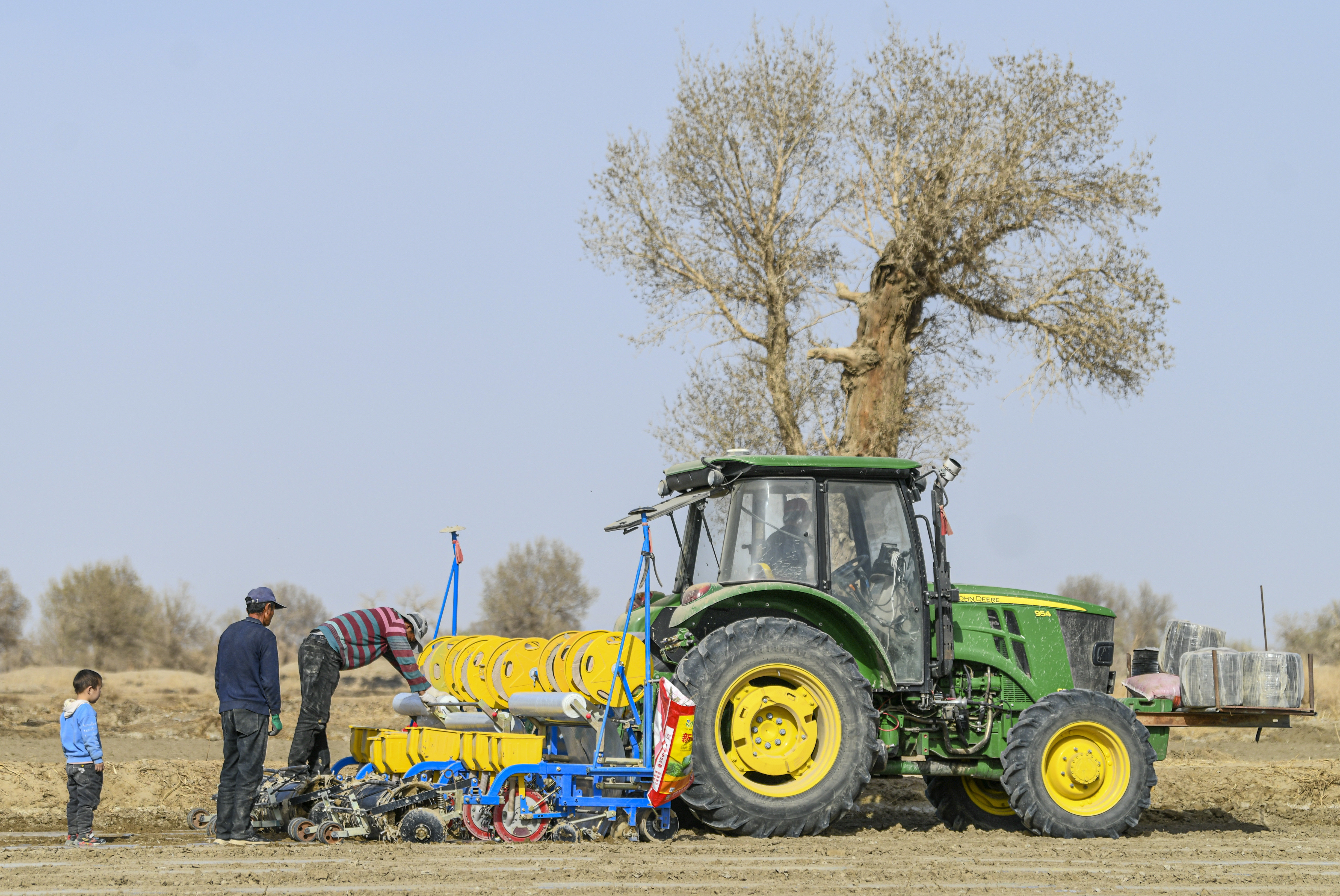 新疆尉犁县,棉农在调试播种机(3月30日摄)。新华社记者 王菲 摄