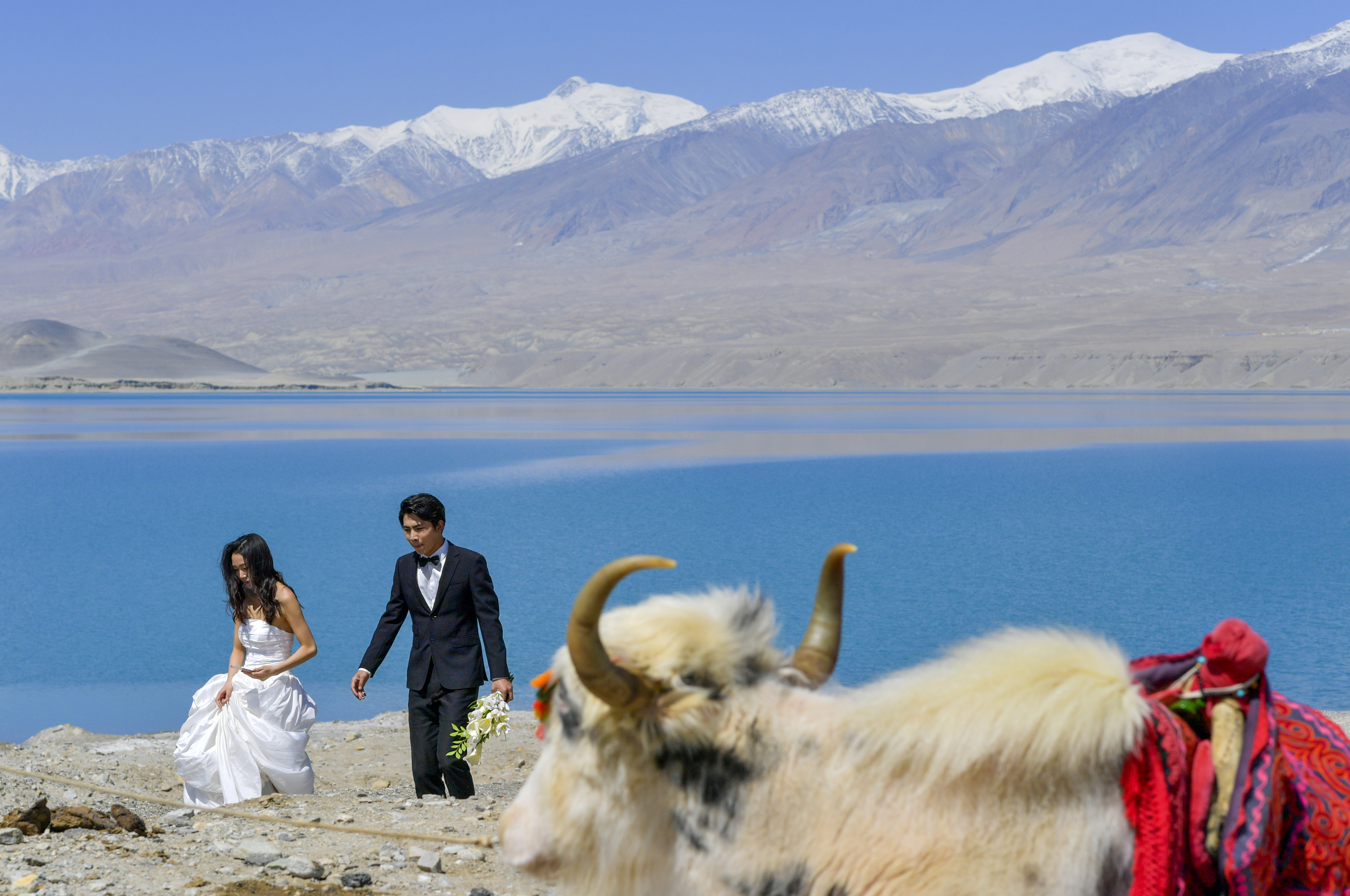 新疆阿克陶县境内的白沙湖风景区,一对年轻人在湖边拍摄婚纱照(4月14日摄)。新华社记者 王菲 摄