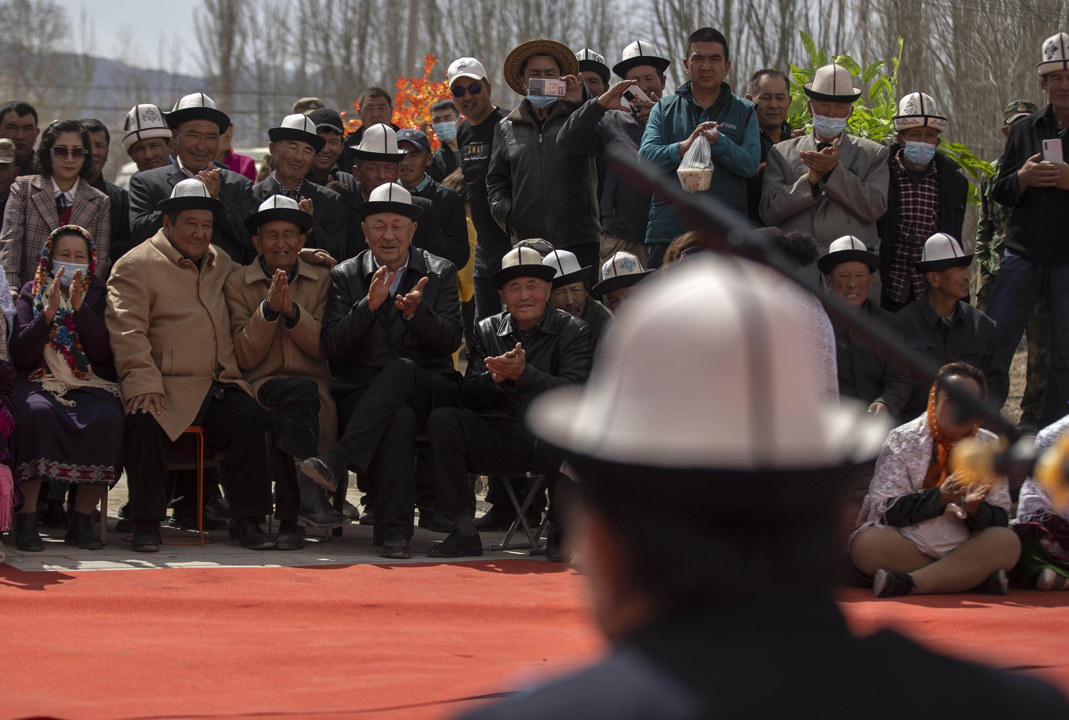 新疆克孜勒苏柯尔克孜自治州别迭里村,观众为《玛纳斯》非物质文化遗产传承人阿不都别克·俄斯坎的表演鼓掌喝彩(4月10日摄)。新华社记者 费茂华 摄
