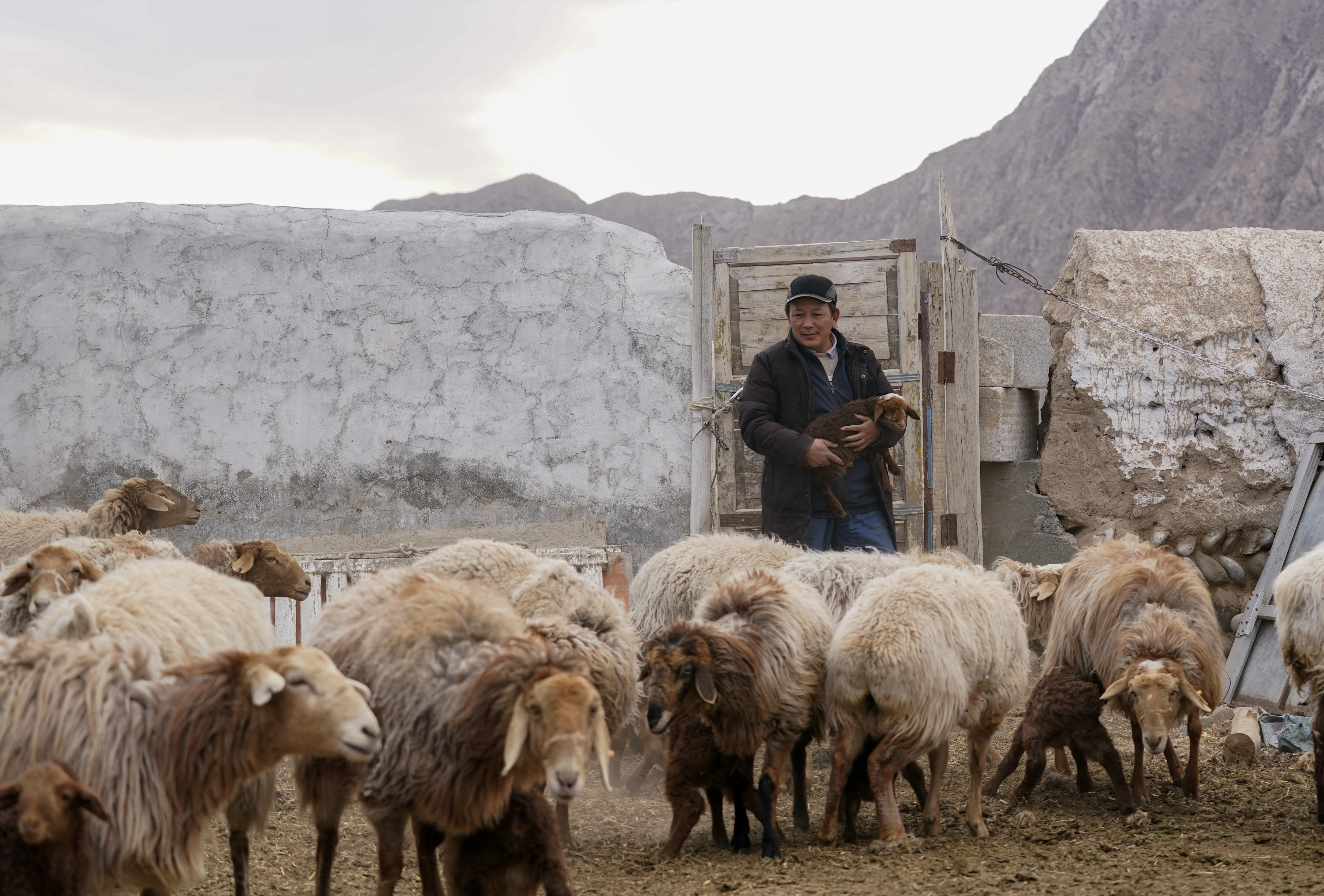 新疆克孜勒苏柯尔克孜自治州阿合奇县哈拉奇乡阿合奇村,46岁的阿不都别克在自家羊圈里(4月10日摄)。新华社记者 赵戈 摄