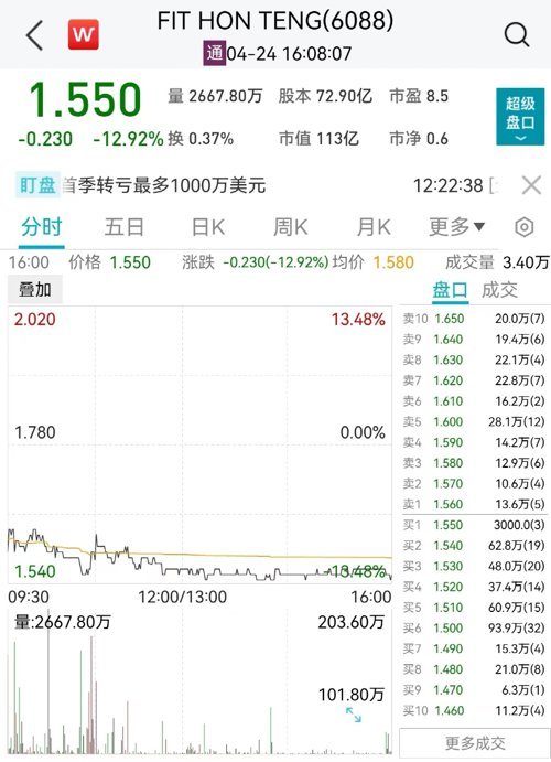 富士康(远东)子公司鸿腾精密上周五收盘后发布盈利预警,4月24日,公司股价大幅低开,最高跌幅达13.48%,收于1.55港元,跌幅12.92%。