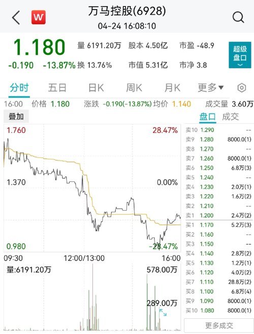 4月24日,万马控股早盘高开港元,随后一度冲高逾22%,午后股价快速转跌,尾盘跌幅扩大至28.47%,全天振幅超55%。最终收于1.18元,跌13.87%,换手率达13.76%。