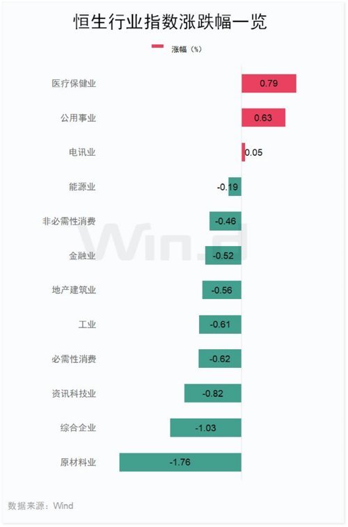 从行业表现看,恒生行业指数日内多数下跌,原材料业跌1.76%,综合企业跌1.03%,资讯科技业跌0.82%。涨幅方面,医疗保健业涨0.79%,公用事业涨0.63%,电讯业涨0.05%。