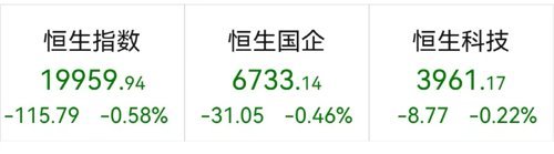 4月24日,港股小幅低开随后盘整震荡,午前快速走弱,午后跌势进一步扩大恒指一度跌1.7%,尾盘跌幅显著收窄。恒生指数收跌0.58%报19959.94点,恒生科技指数跌0.22%报3961.17点,恒生国企指数跌0.46%报6733.14点。大市成交964.4亿港元,南向资金净买入1.95亿港元。