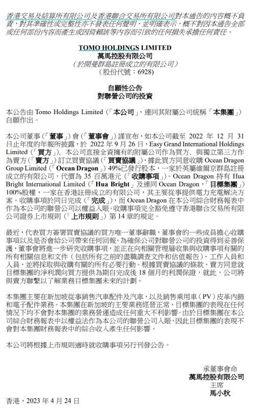 万马控股发布公告表示,有关其全资附属Easy Grand International以3,500万元代价收购Ocean Dragon的49%已发行股本,后者持有从事提供电力充电解决方案Hua Bright的100%股权,公司指出,最近代表买方签署买卖协议的买方唯一董事辞职,董事会的一些成员担心收购事项以及是否会给公司带来任何回报。为确保公司对联营公司的投资得到妥善保护,公司将进一步研究上述收购事项。