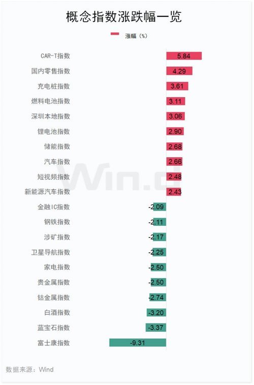 从盘面来看,Wind概念板块多数下跌,富士康指数跌9.31%,蓝宝石指数跌3.37%,白酒指数跌3.2%。涨幅方面,CAR-T指数涨5.84%,国内零售指数涨4.29%,充电桩指数涨3.61%。