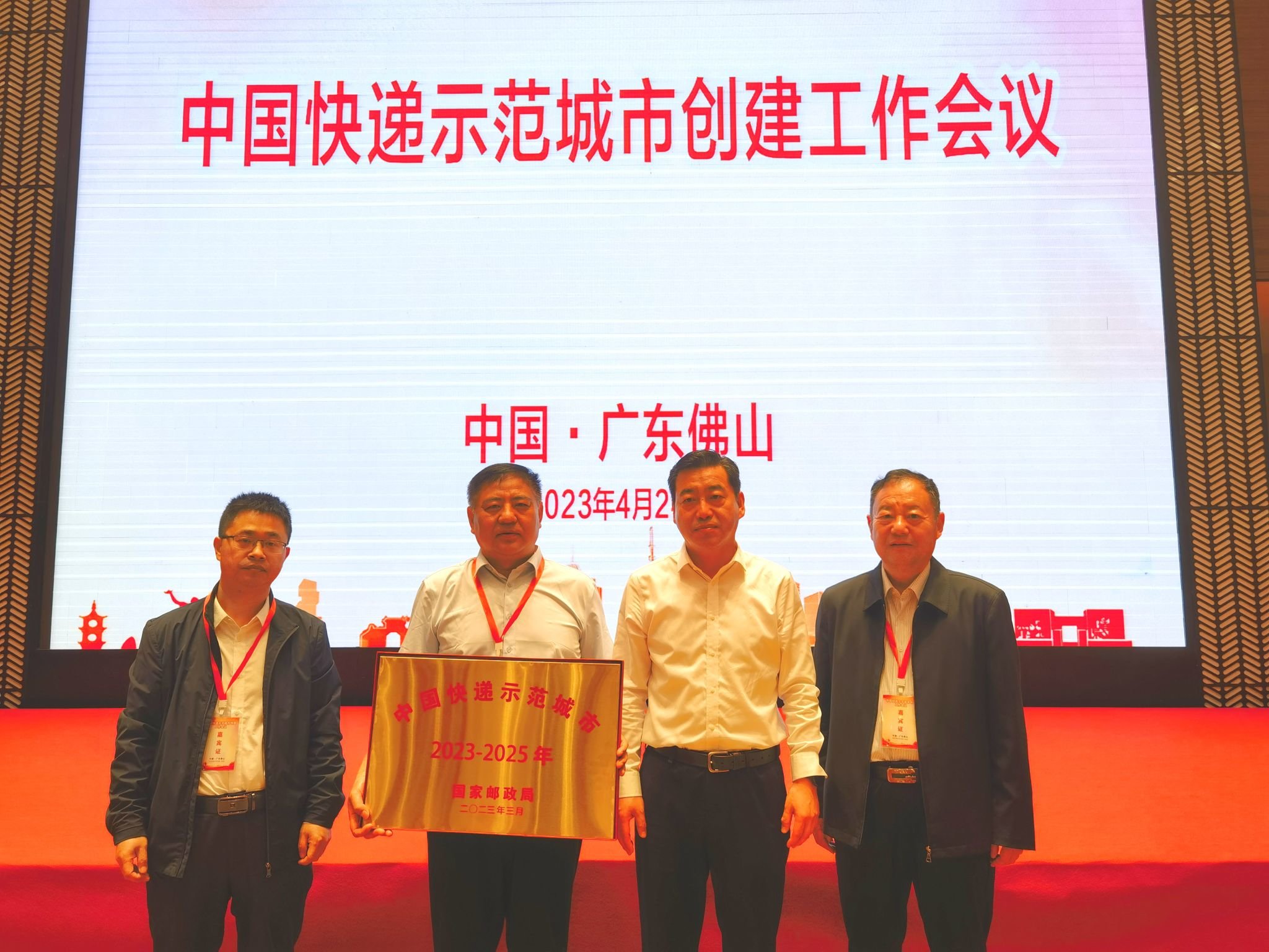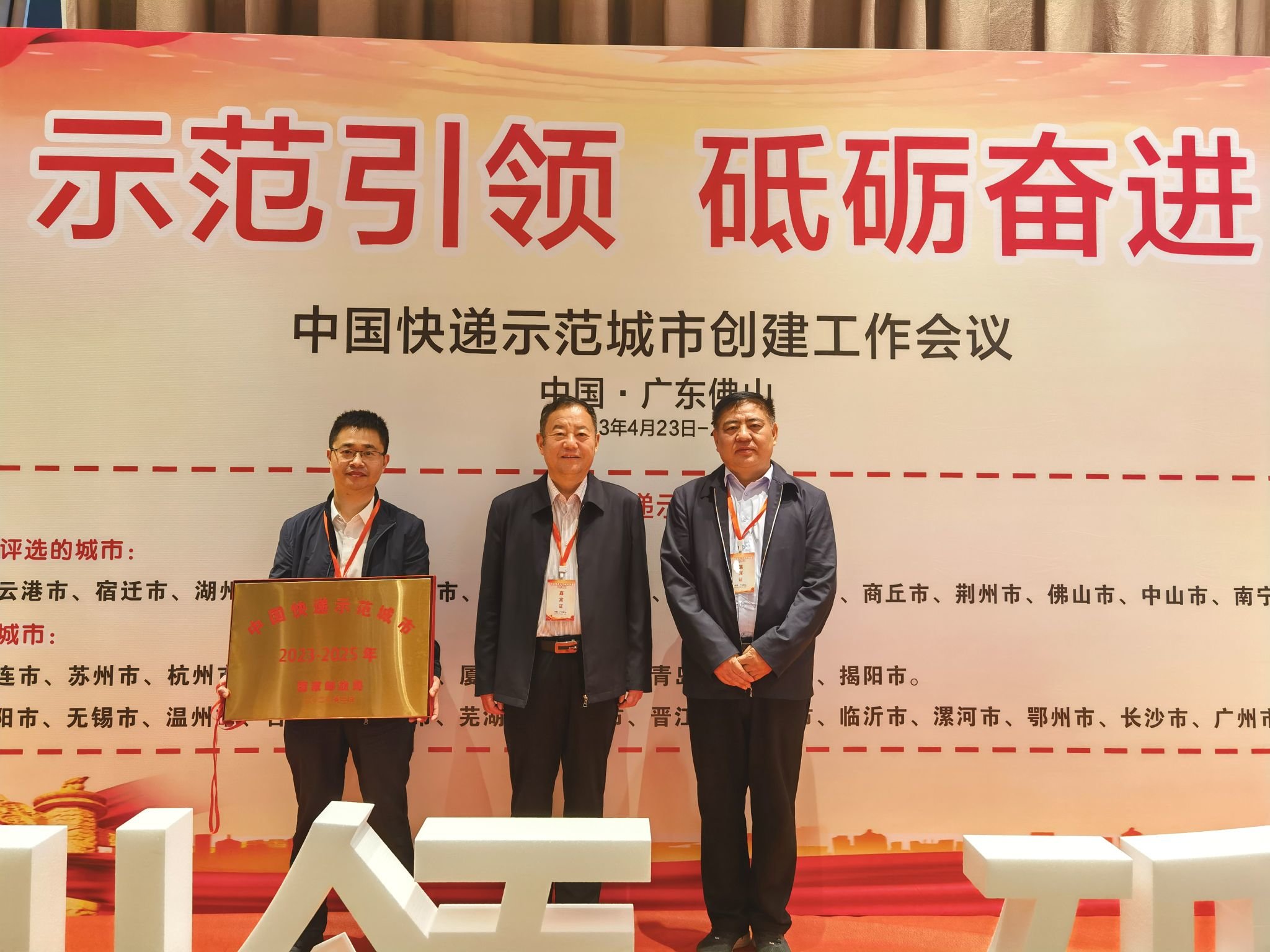 4月24日,国家邮政局在广东省佛山市召开“中国快递示范城市”创建工作会议,商丘荣获“中国快递示范城市”称号。商丘市政府党组成员梁万涛代表商丘市接受授牌颁奖。