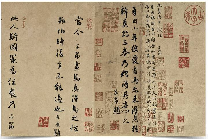 幅上有题款:“元贞丙申岁(1296年)作,子昂。”钤朱文印两方:“赵氏子昂”“澄怀观道”。又自识:“画固难,识画尤难。吾好画马,盖得之于天,故颇尽其能事。若此图,自谓不愧唐人。世有识者,许渠具眼。大德己亥(1299年)子昂重题。”卷末自题云:“吾自少年便爱画马,尔来得见韩干真迹三卷,乃始得其意云。”