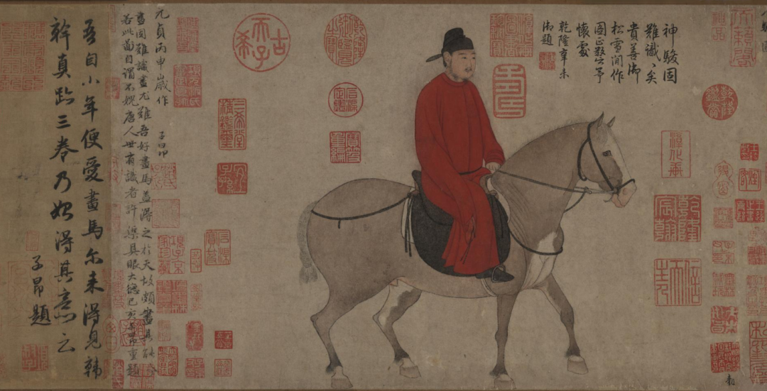 34岁这一年,赵孟頫被推荐给了朝廷,得到元世祖忽必烈的接见,后被授予兵部郎中一职,历经元成宗、元武宗。到元仁宗时,尽管皇帝身边的元朝贵族们不放心他的赵宋宗室身份,但元仁宗仍然重用赵孟頫,赵孟頫很感动,颇有种“得遇明主”的感觉。于是,在接下来的日子里,赵孟頫画了很多幅关于马的画,意指“春风得意马蹄疾”,其中就有这幅代表作之一《人骑图》卷。