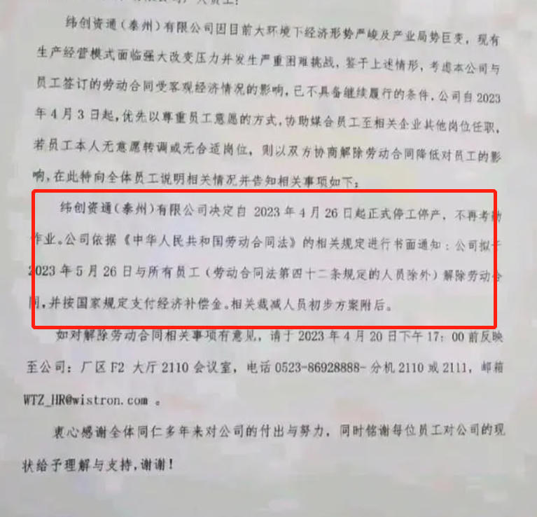 鞭牛士 4月26日消息,近日,全球第三大笔记本电脑代工大厂宣布,旗下位于中国大陆的泰州厂因连年亏损,将于4月26日停工停产,并拟于5月26日与所有员工解除劳动合约,并按规定支付经济补偿金。