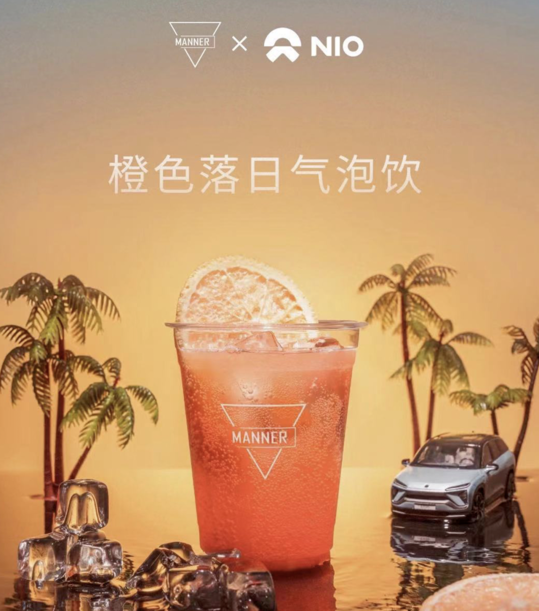 例如蔚曾与咖啡品牌Manner联名推出橙色落日气泡饮,主推环保与可持续发展的生活理念。此外,品牌携手李宁,推出“我是冠军”李宁定制限量系列,将汽车与科技元素融入服饰、包、鞋三个品类,将蔚来车型的特殊配色与李宁的科技面料结合,主打融入年轻人的生活方式。