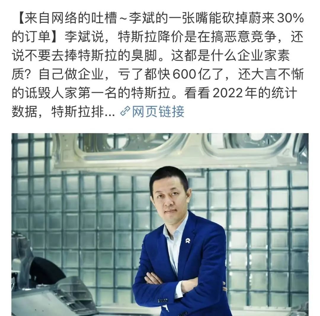 蔚来汽车董事长李斌也是车企老板中的话题性人物。他本人在接受媒体采访时经常“语出惊人”,“沃尔沃学不会换电”、“蔚来不参加价格战”等言论一度让品牌站上风口浪尖,甚至有网友吐槽“李斌的一张嘴能砍掉蔚来30%的订单”。