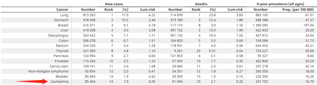 根据WTO的数据显示,我国每年新增白血病病例约为8.5万例。在我国癌症新发病例中,白血病在第14位。