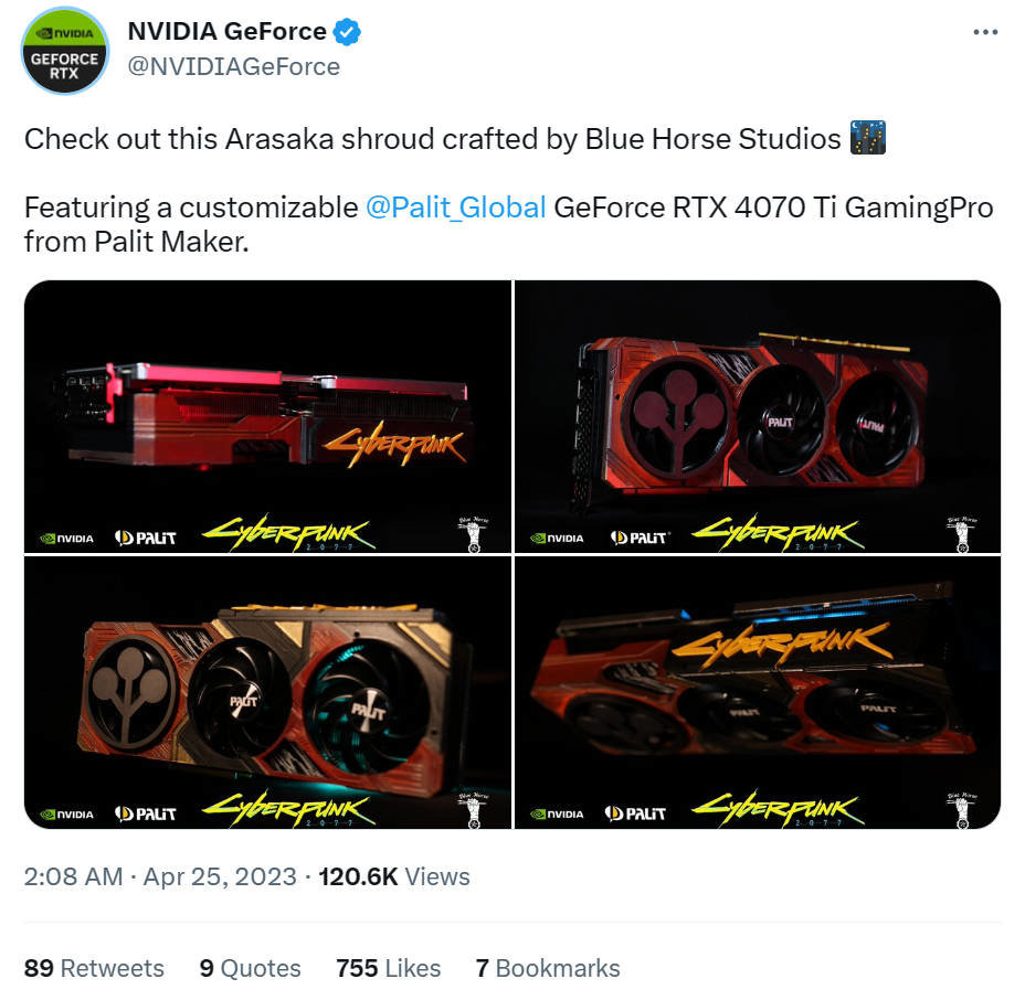 英伟达官方最近在社交媒体上展示了一款基于《赛博朋克 2077》主题的GeForce RTX 4070 Ti显卡,英伟达介绍这是由@Palit_Global定制的GeForce RTX 4070 Ti GamingPro显卡,Palit中文为同德,是中国台湾的一家显卡OEM厂商。