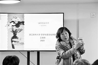 王教授1982年毕业于浙江大学历史系,在报社担任记者编辑。1989年,她在报纸上看到一则中国茶叶博物馆的招聘信息,前往应聘,由此与茶结缘。当时,对茶文化不是特别了解的她一头扎在馆内的资料室里,并采访了很多茶界专家,为博物馆撰写解说词、培训讲解员,参与了整个茶博的筹建工作,“从一个对茶只有感性认识、原本喝茶不多的人,变成了一个从此与茶相伴相生的茶人。”